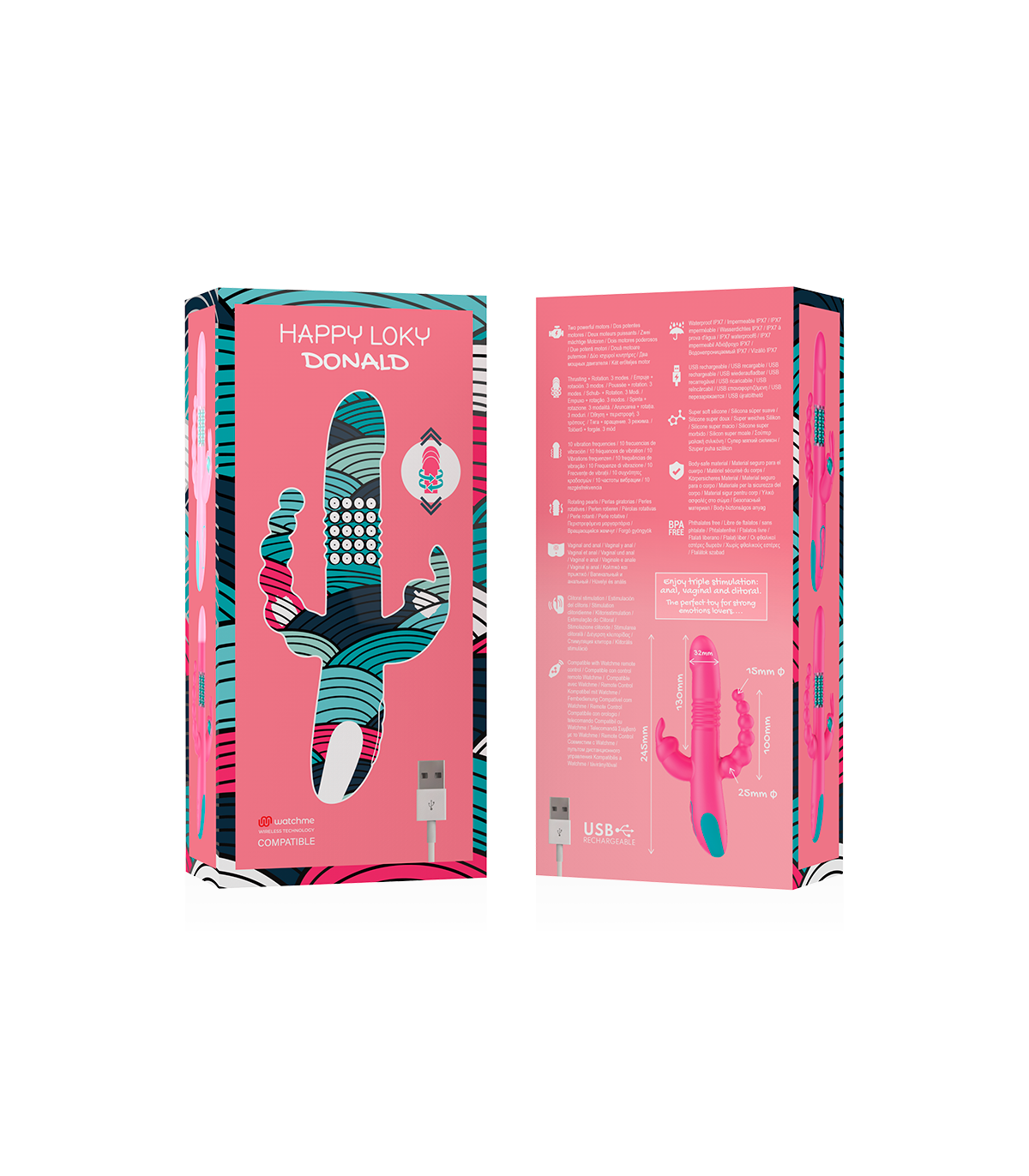 Disfruta de la triple estimulación: anal, vaginal y de clítoris. El juguete perfecto para los amantes de las emociones fuertes. La gama DONALD TRIPLE ESTIMULACIÓN ANAL, PUNTO G & CLÍTORIS incorpora un conjunto de funciones nunca antes visto en un vibrador: estimulación del punto G gracias a su base de suaves perlas giratorias, penetración mediante la asombrosa función “up & down“, estimulación anal mediante bolas vibradoras, estimulación del clítoris gracias a su increíble "rabbit" y, además, es compatible con la novedosa tecnología de control remoto Watchme.