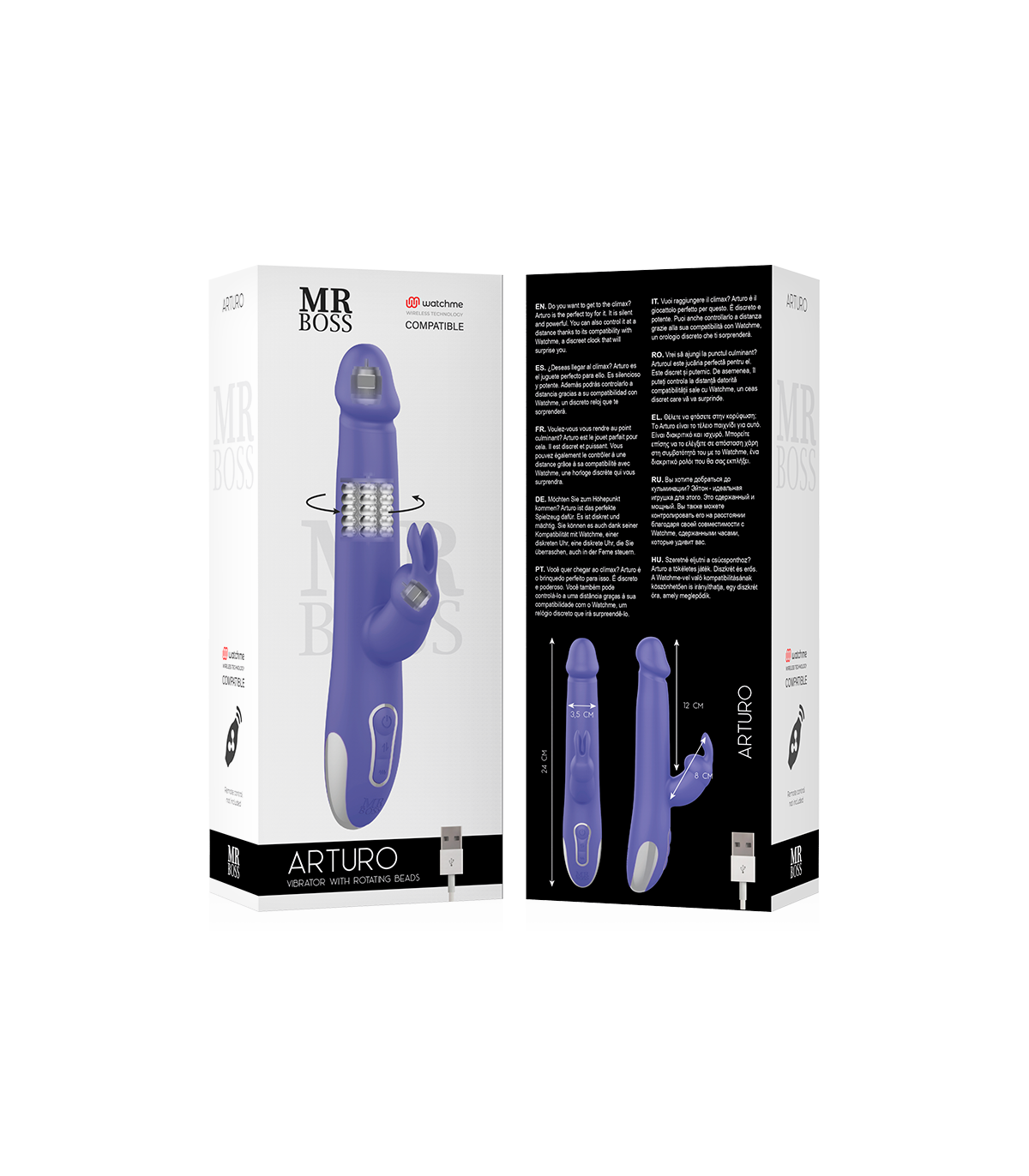 La gama ARTURO VIBRATOR & ROTATOR incorpora un conjunto de funciones nunca antes visto en un vibrador: estimulación del punto G gracias a su base de suaves perlas giratorias y su potente punta vibradora, estimulación del clítoris gracias a su increíble "rabbit" y, además, es compatible con la novedosa tecnología de control remoto Watchme.