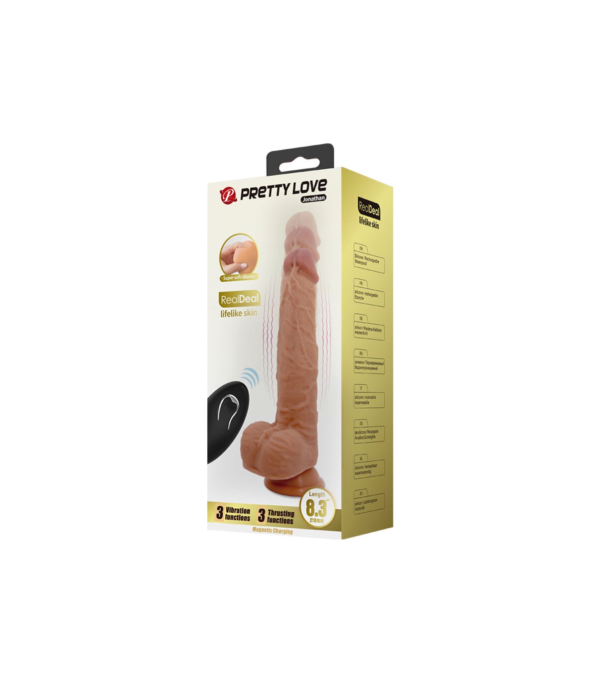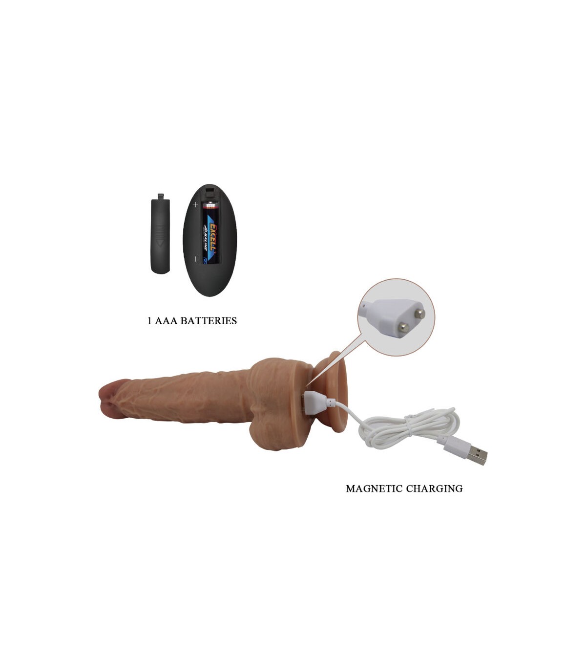 Un vibrador de empuje y vibración con forma de pene realista con una fuerte ventosa que se adhiere a cualquier superficie lisa. La ventosa hace posible la diversión con manos libres. Los 3 modos de vibración y empuje se pueden controlar por separado mediante el mando a distancia o por un compañero. El dador de placer, que empuja y vibra, está cubierto de silicona suave que se siente muy bien contra la piel. El vibrador realista es excitantemente firme y duro sin perder flexibilidad gracias a este material. El material de silicona suave y sedoso parece piel real y también se siente tan suave como el terciopelo. Se puede recargar con el puerto de carga magnético en el extremo del juguete