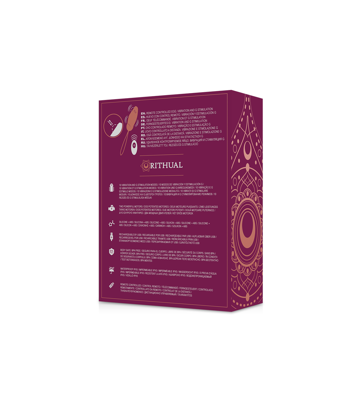 Las balas vibradoras Rithual miman mucho con 10 programas intensivos de vibración. Lo mejor de ella es el práctico mando a distancia, con el que puedes elegir entre los programas con solo pulsar un botón. ¡Para esa vibración especial, también puedes dejar el control a tu amante!  Ya sea en la universidad, en celebraciones familiares, en el trabajo o simplemente entre las sábanas, con las balas vibradoras de Rithaul tu vida diaria será mucho más brillante. Gracias a su material impermeable puede usarse bajo el agua con categoría IPX5 .