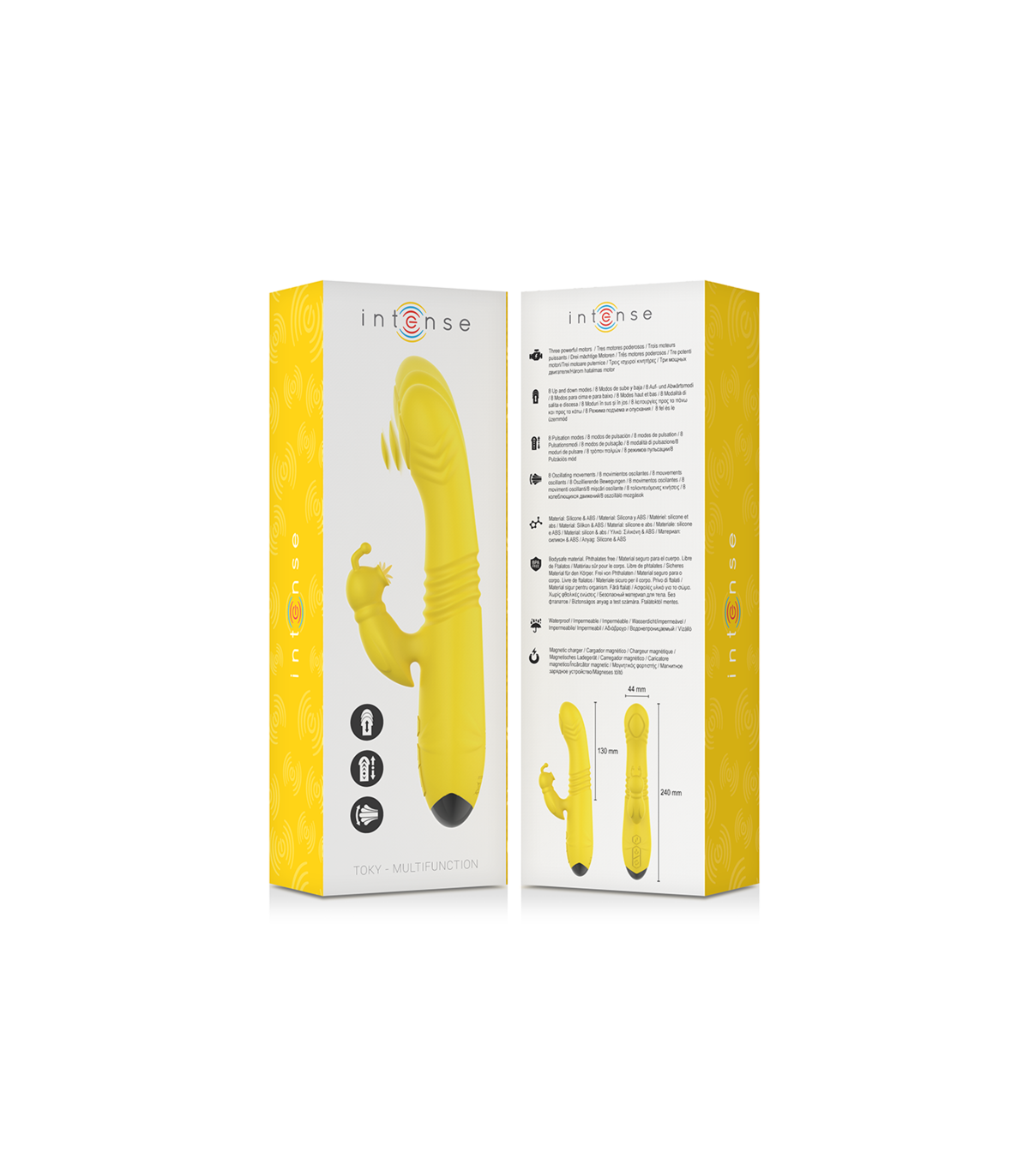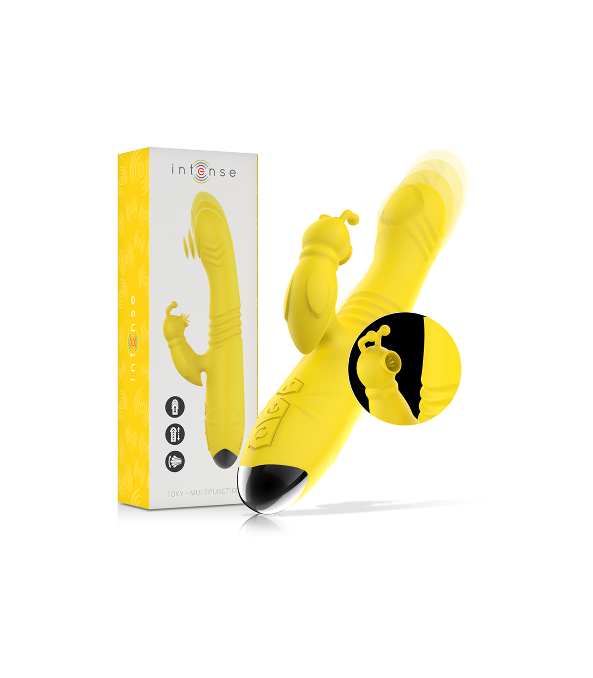 El vibrador multifunción TOKY de la marca INTENSE es un juguete sexual excepcional diseñado para llevar tu placer a un nivel superior. Este vibrador recargable, con movimiento up&down (arriba y abajo), ofrece una experiencia de estimulación sin igual. Con 8 tipos de pulsación y un estimulador de clítoris en forma de insecto que cuenta con 8 modos de lamer, TOKY está diseñado para satisfacer tus deseos más profundos.