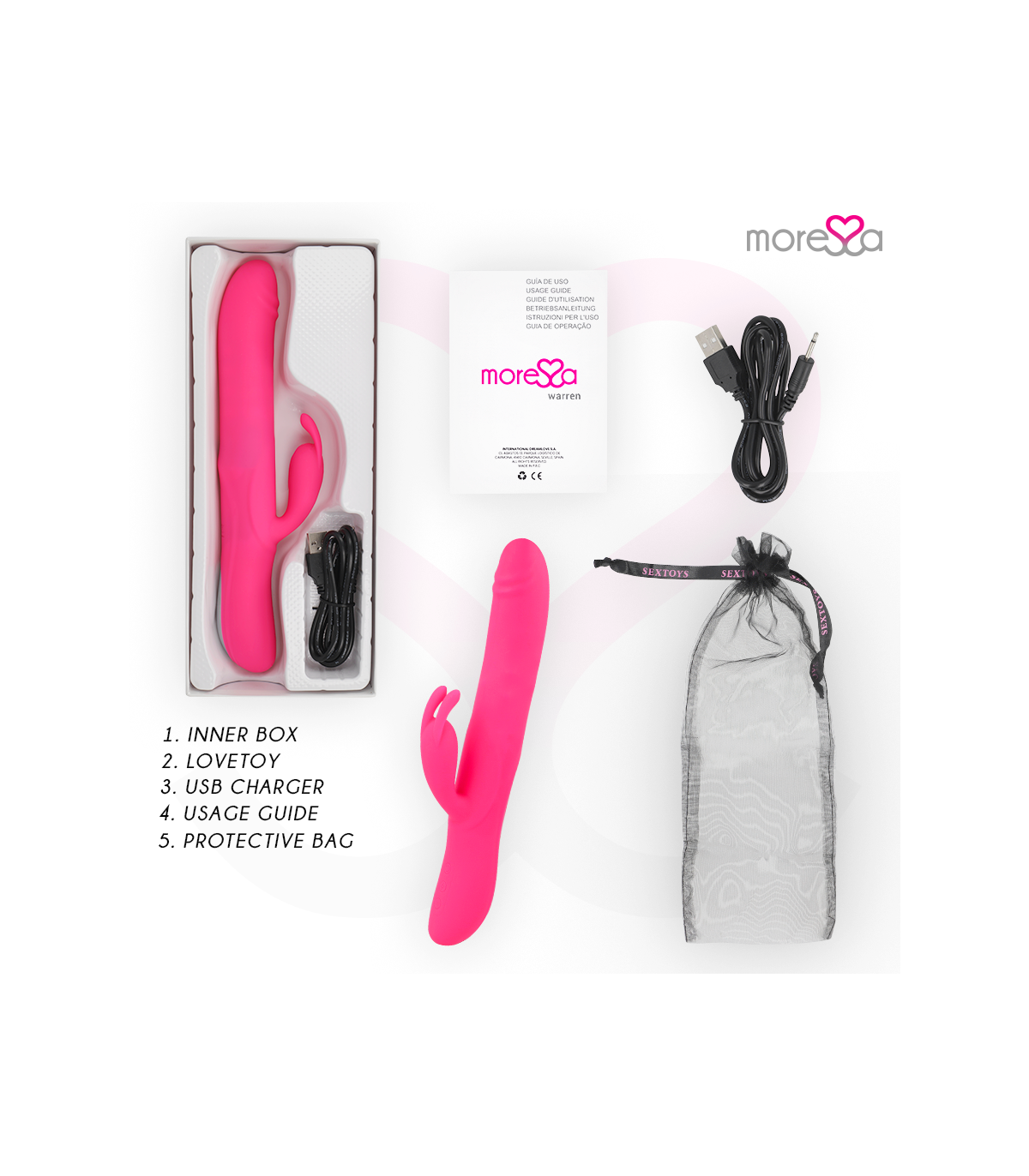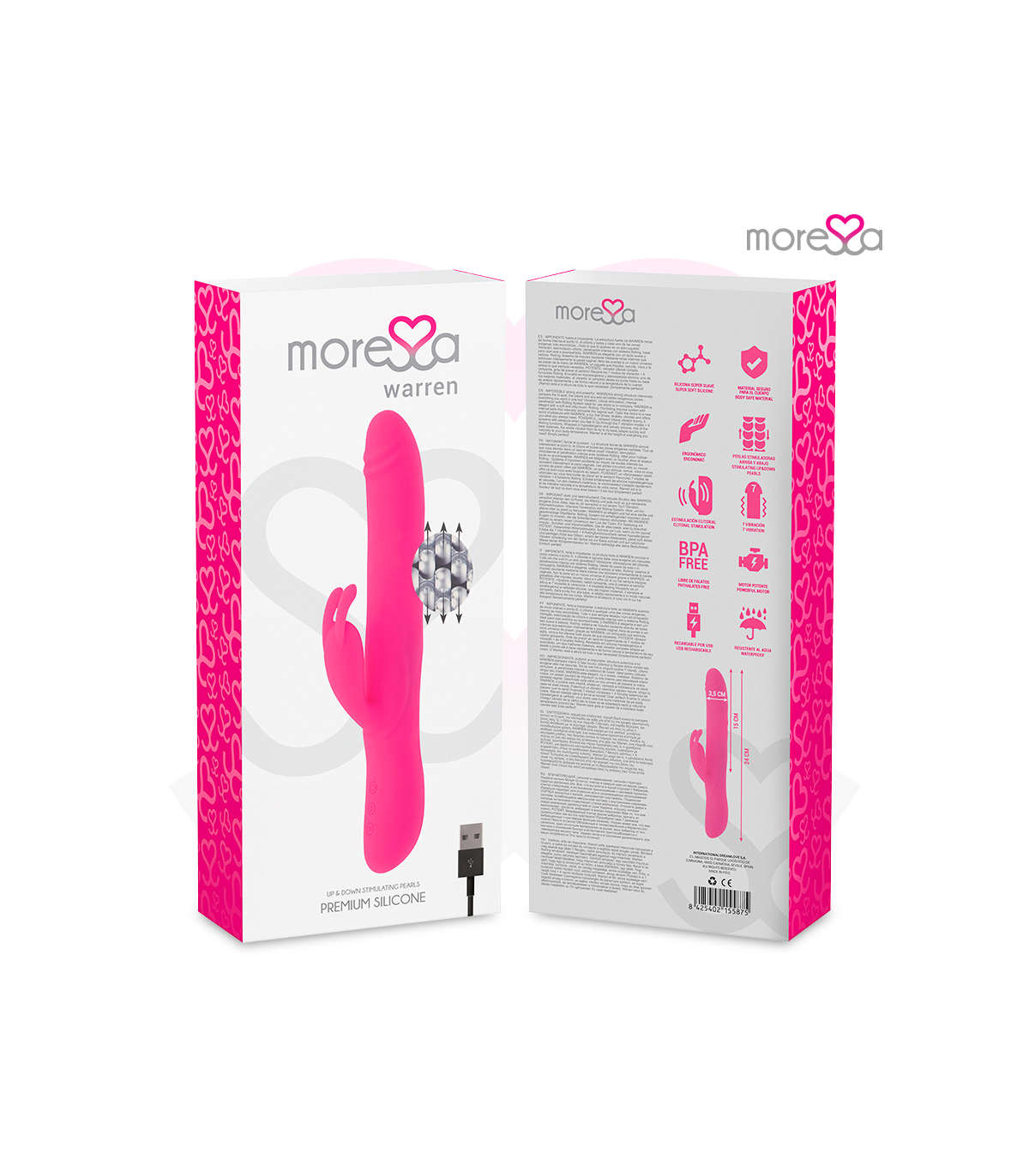 en el orificio de conexión de carga. Enchufar a la corriente con un conector o al ordenador mediante USB.Moressa es la marca referente por su diseño, calidad y tecnología. Hemos desarrollado un producto innovador y mimado cada proceso de fabricación para conseguir el mejor resultado. Moressa es símbolo de energía, fuerza y garantía. Comprar un Sextoy Moressa es sentirse reflejado con la actualidad. Cada Juguete Moressa te transportara a diferentes sensaciones. Un resultado inigualable gracias a la silicona Premium confortable y los diseños ergonómicos.