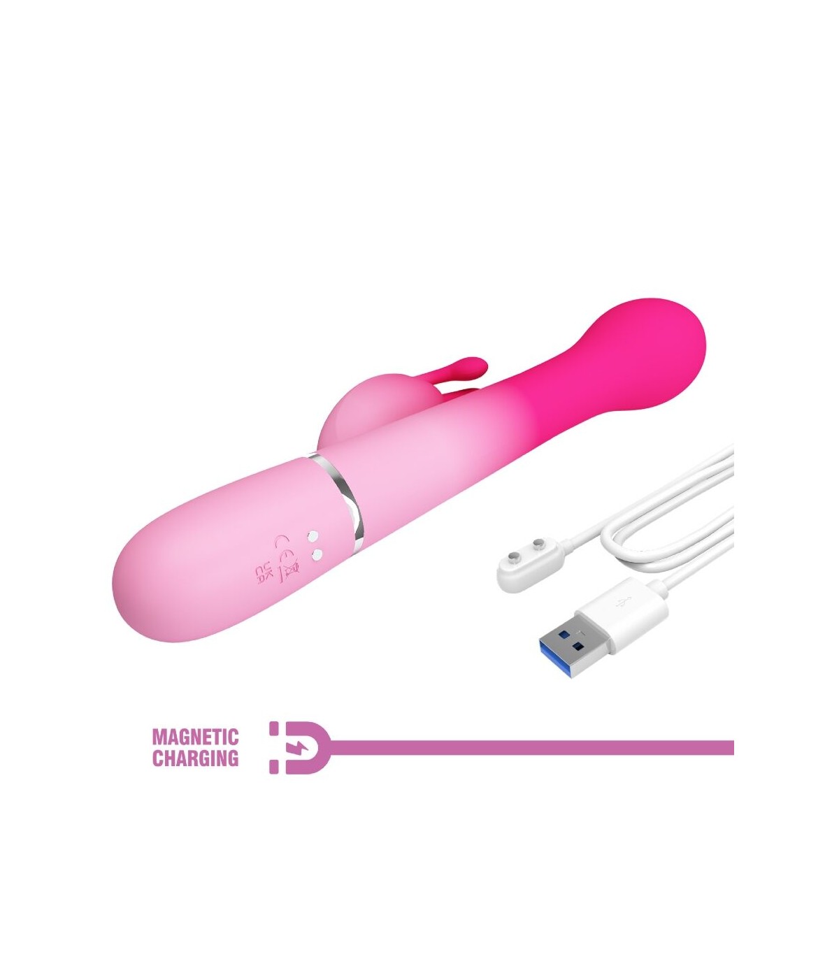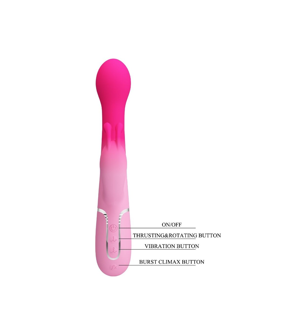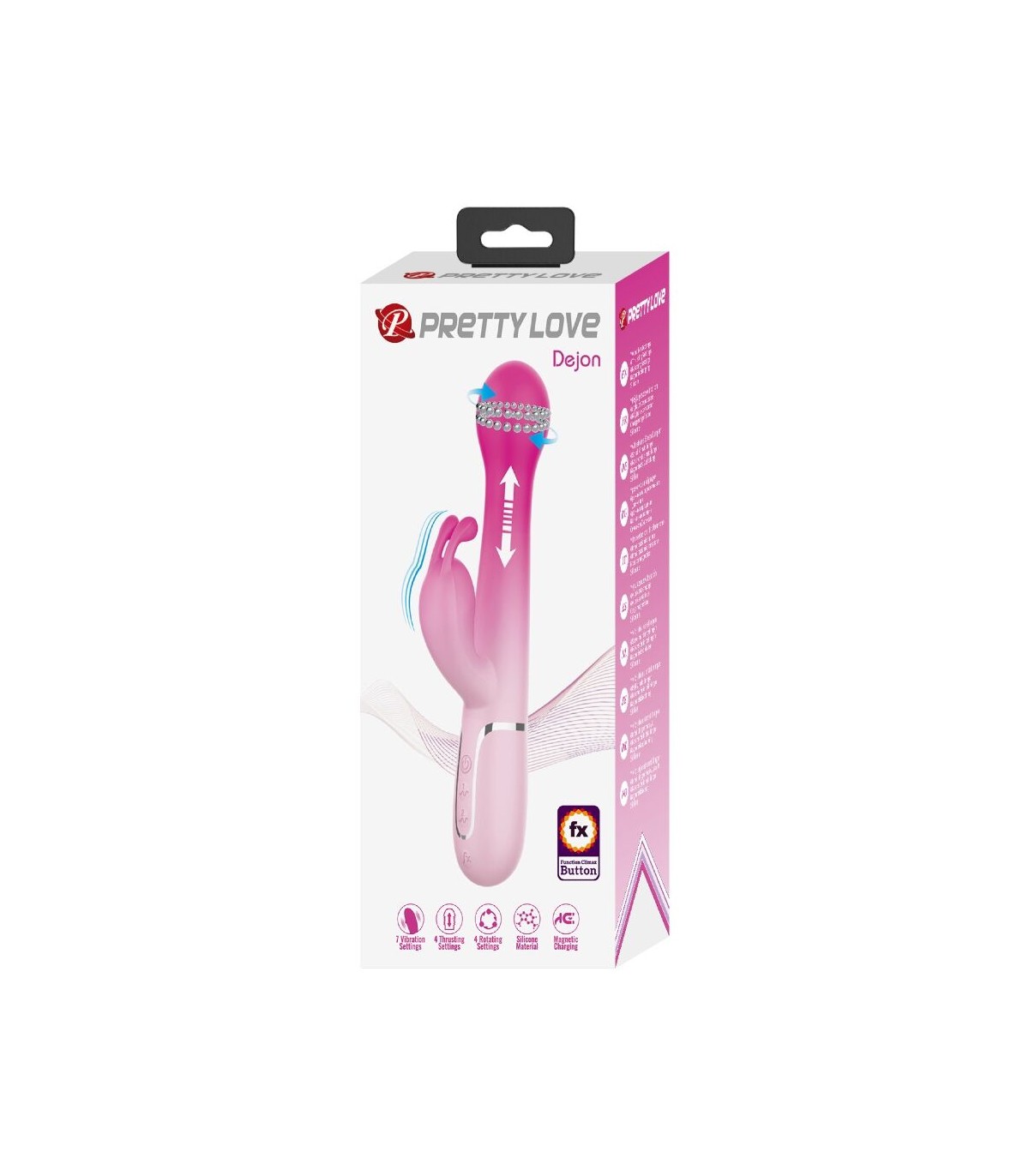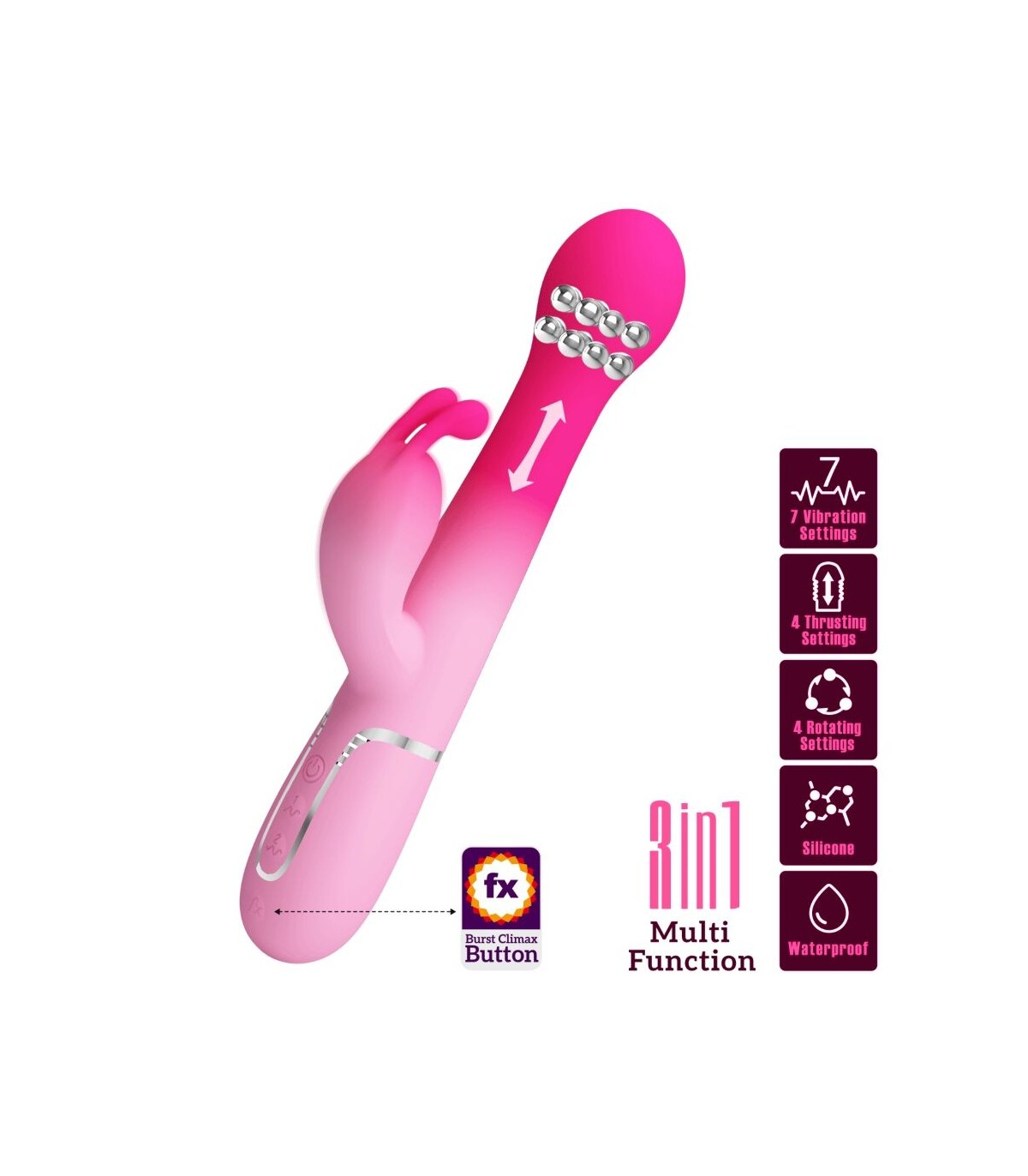 Diseñado para el máximo placer, quédate en la cama con el vibrador Rabbit de Pretty Love. Con potentes motores gemelos, uno ubicado en la punta y el otro en el brazo externo, te prometemos que encontrarás tu vibración perfecta, ya que 7 intensidades y ritmos de vibración te llevarán a un poderoso clímax combinado. Con una sola fila de perlas rígidas que se desplazan hacia arriba y hacia abajo en un emocionante masaje íntimo, disfruta de las tres configuraciones de velocidad mientras frota constantemente contra tu punto dulce sensible. Para un mayor placer, presiona el botón Burst Climax para explorar tus increíbles y estremecedores orgasmos