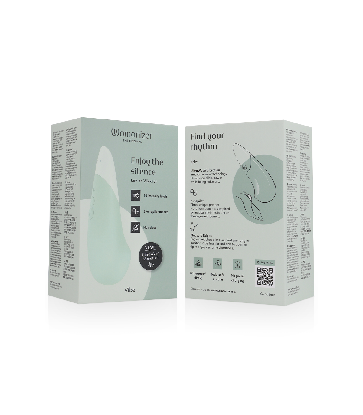 Vibrador silencioso de Womanizer. Vibrador silencioso que ofrece una nueva sensación con la Vibración UltraWave: combina vibraciones retumbantes de baja frecuencia con 10 potentes resonancias armónicas. Disfruta de una sensación suave y enriquecedora que intensifica tus sentidos y eleva tu orgasmo sin sobreestimulación.