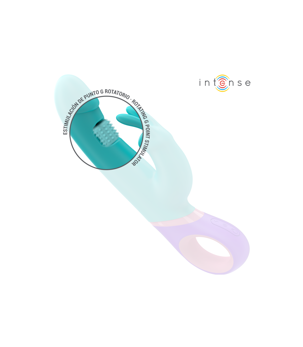 El vibrador MONICA de la marca INTENSE es un elegante vibrador rabbit en un atractivo color azul, diseñado para ofrecer una experiencia sensual completa gracias a su doble estimulación y su innovador estimulador rotatorio para el punto G.