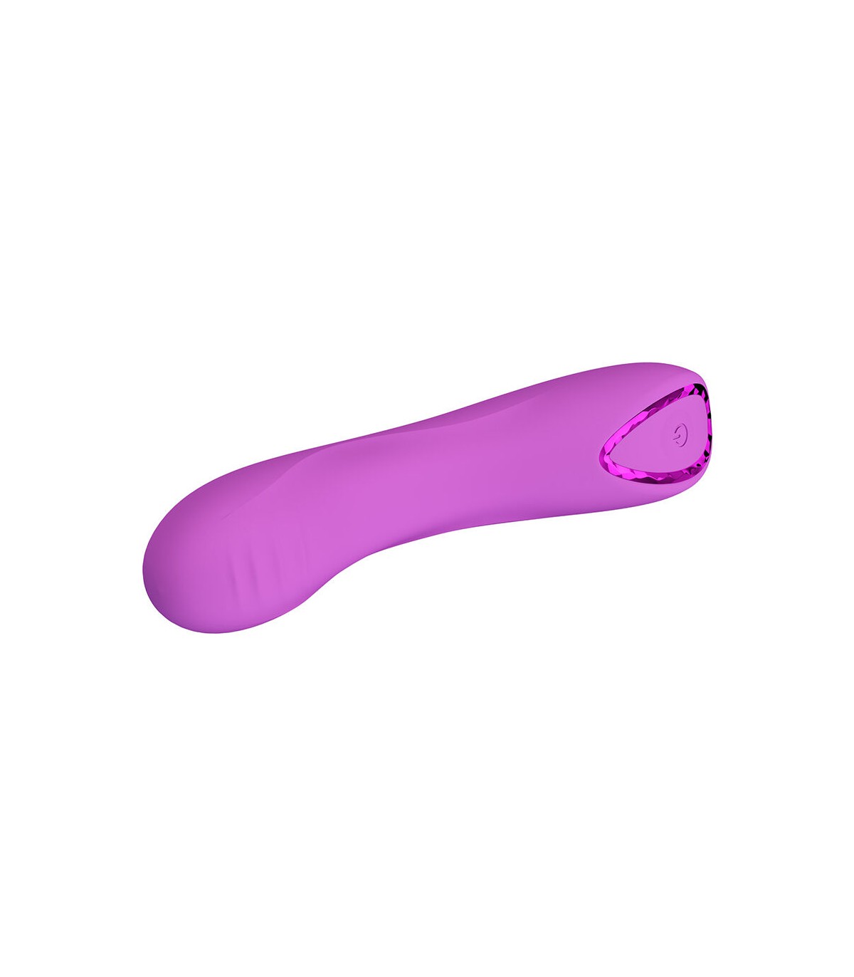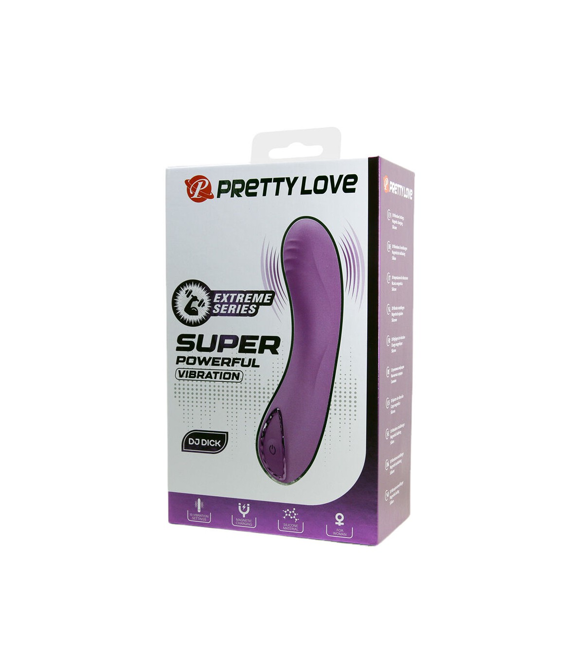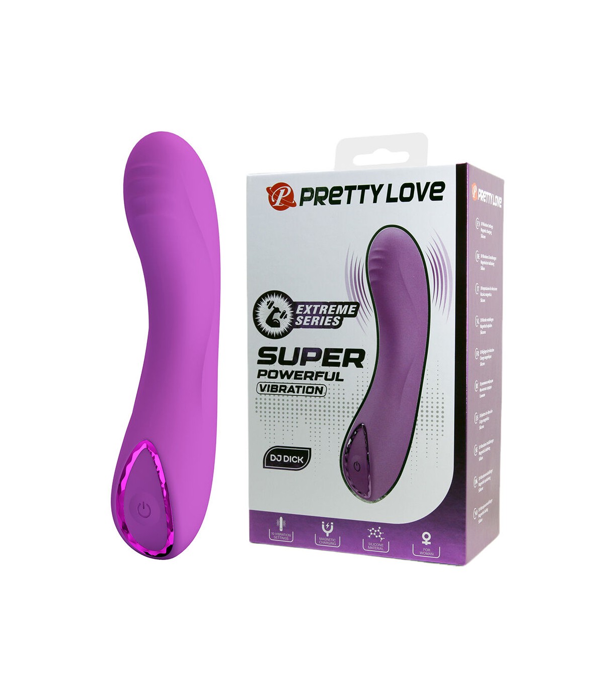 Elegante vibrador Pretty Love de la línea Extreme Series, presentado en un intenso color violeta y diseñado para atraer todas las miradas gracias a su sofisticado anillo decorativo brillante.