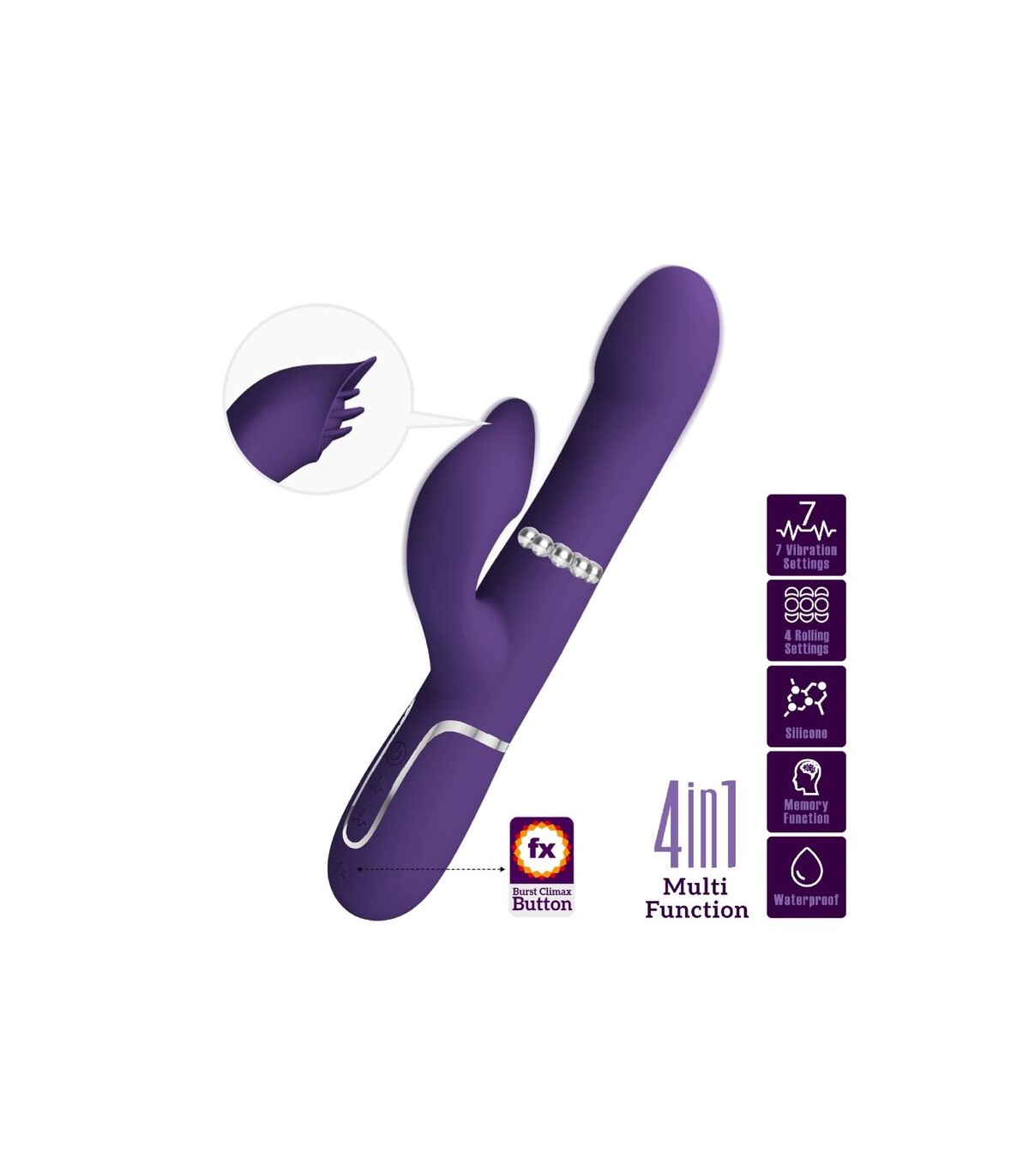 Diseñado para el máximo placer, quédate en la cama con el Vibrador Conejo Pretty Love. Con potentes motores gemelos, uno ubicado en la punta y el otro en el brazo externo, te prometemos que encontrarás tu vibración perfecta mientras 7 intensidades y ritmos de vibración te llevan a un poderoso clímax combinado. Con una sola fila de perlas rígidas que viajan hacia arriba y hacia abajo en un emocionante masaje íntimo, disfrute de las tres configuraciones de velocidad mientras frota constantemente su sensible punto dulce. Para mayor placer, presione el botón Burst Climax para explorar sus increíbles y trascendentales orgasmos.