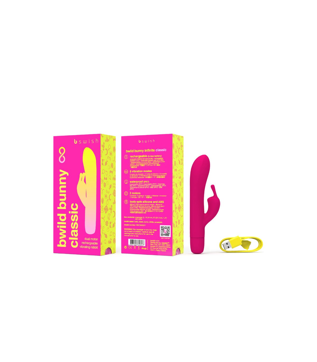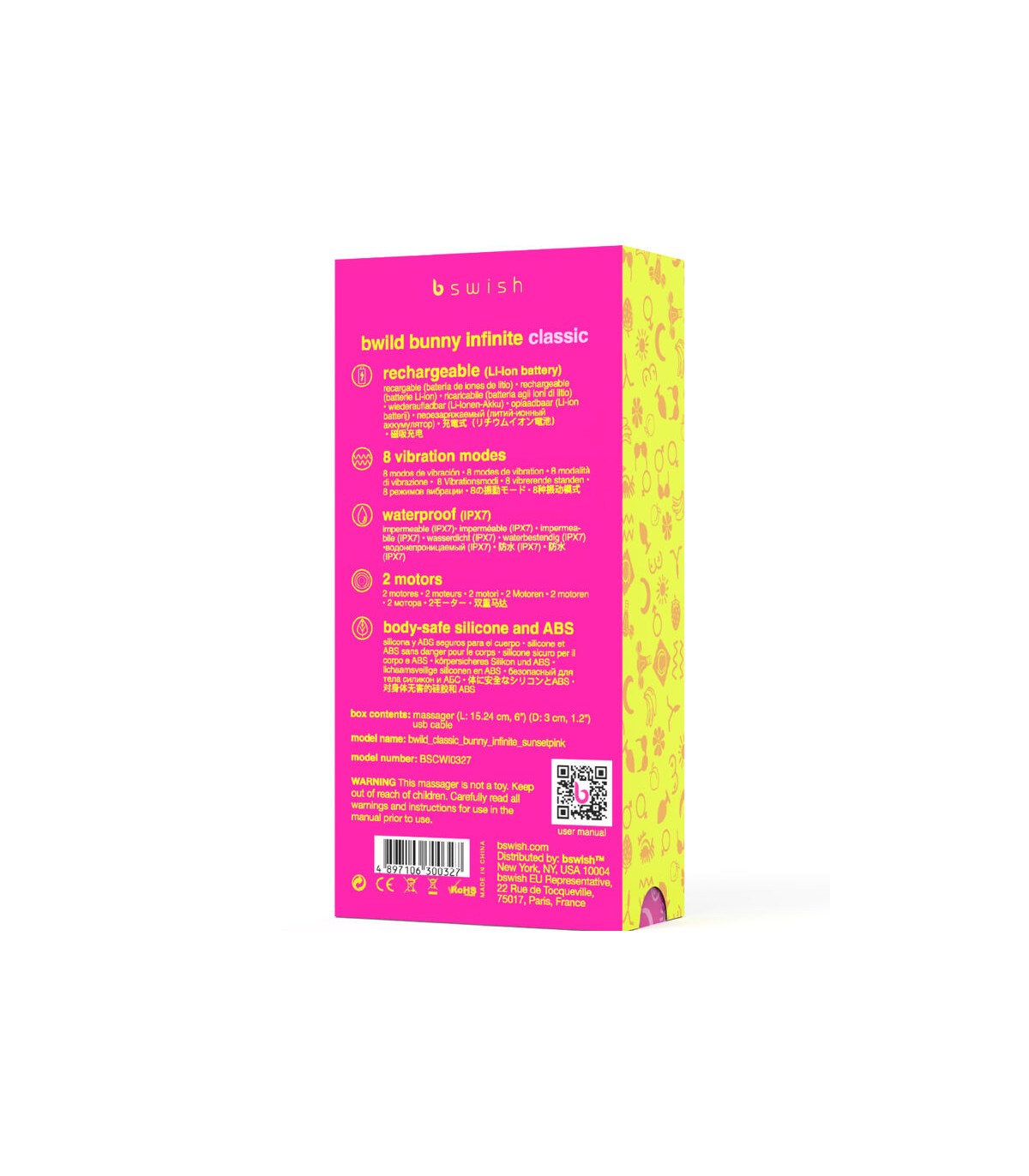 Conoce el 'OG' del placer, Bwild Bunny Infinite Classic. Un placer garantizado con sus 2 potentes motores, 4 intensidades de velocidad y 4 patrones. Junto con su silicona 100% segura para el cuerpo, suave como la seda y con curvas, y su cosquilleo tan preciso, es resistente al agua y está lista para dar un chapuzón.