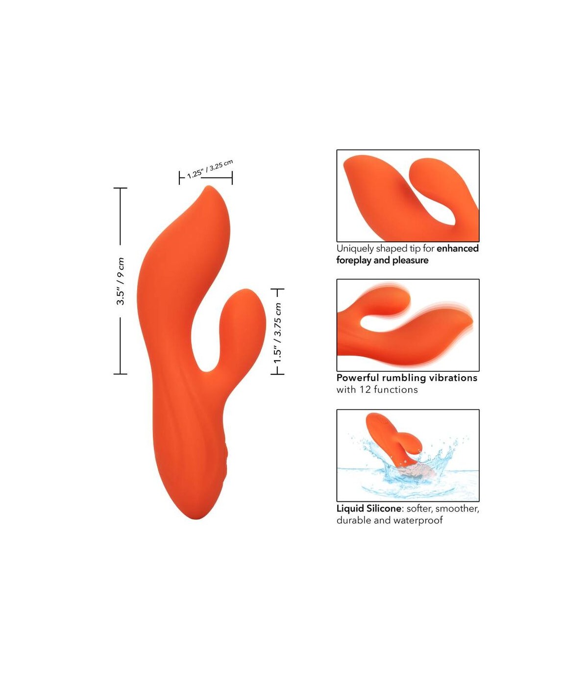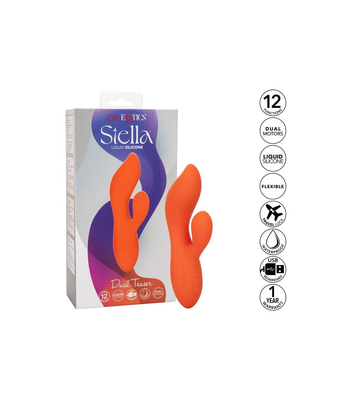 Te dejarás sin aliento con solo tocar un botón con el impresionante teaser dual de silicona líquida Stella. El ambiente dual íntimamente contorneado es tan emocionante como versátil con la punta de forma única, los motores duales y 12 funciones de vibración indulgentes. Abraza la estimulación del punto G que no se agita como nunca has experimentado con la punta del estimulador G acentuado y las intensas pulsaciones de doble motor. Este masajeador dual de alta potencia se crea con un eje G curvo y un estimulador naturalmente contorneado para abrazar las curvas más íntimas. Un motor intenso dentro del eje flexible y otro dentro del teaser proporcionan vibraciones retumbantes para la estimulación juguetonamente poderosa. Disfrute del placer personalizado mientras el eje curvo y el teaser se extienden al ritmo de 12 funciones de vibración. Controle esta variedad de opciones orgásmicas con el botón de control de fácil toque. El masajeador flexible está hecho de silicona líquida higiénicamente superior para una sensación más suave, más suave, más duradera y más flexible. Ya sea que esté tomando un chapuzón con un amante o disfrutando de una sesión de solitario humeante, espere hasta 110 minutos de vibración impermeable. Recarga el placer y regrese al tiempo de juego en solo 2 horas con el cable USB proporcionado. Para disfrutar de su placer, una función de bloqueo de viajes de seguridad requiere que mantenga presionado el botón de encendido/apagado durante 3 segundos para encender o apagar.