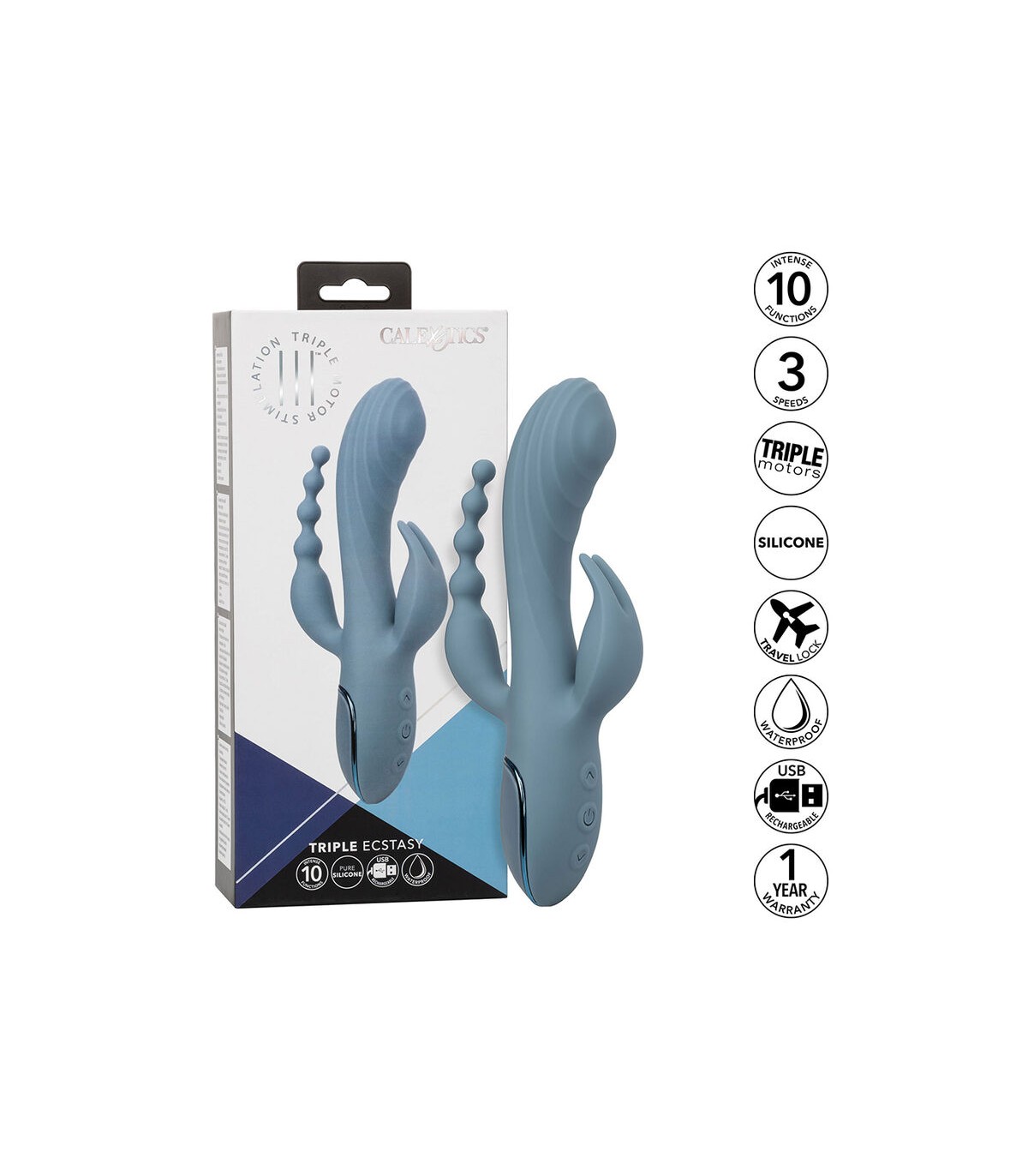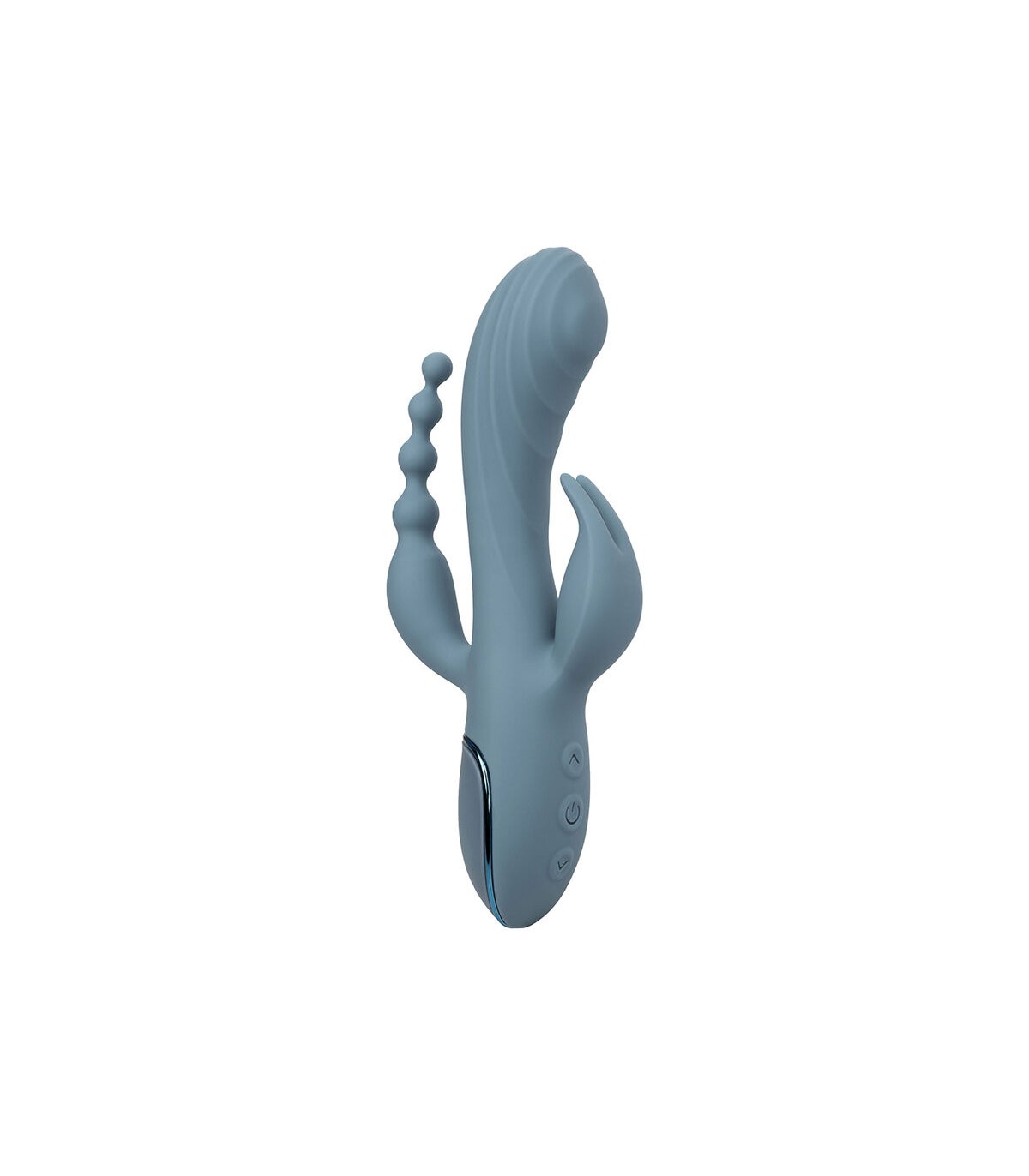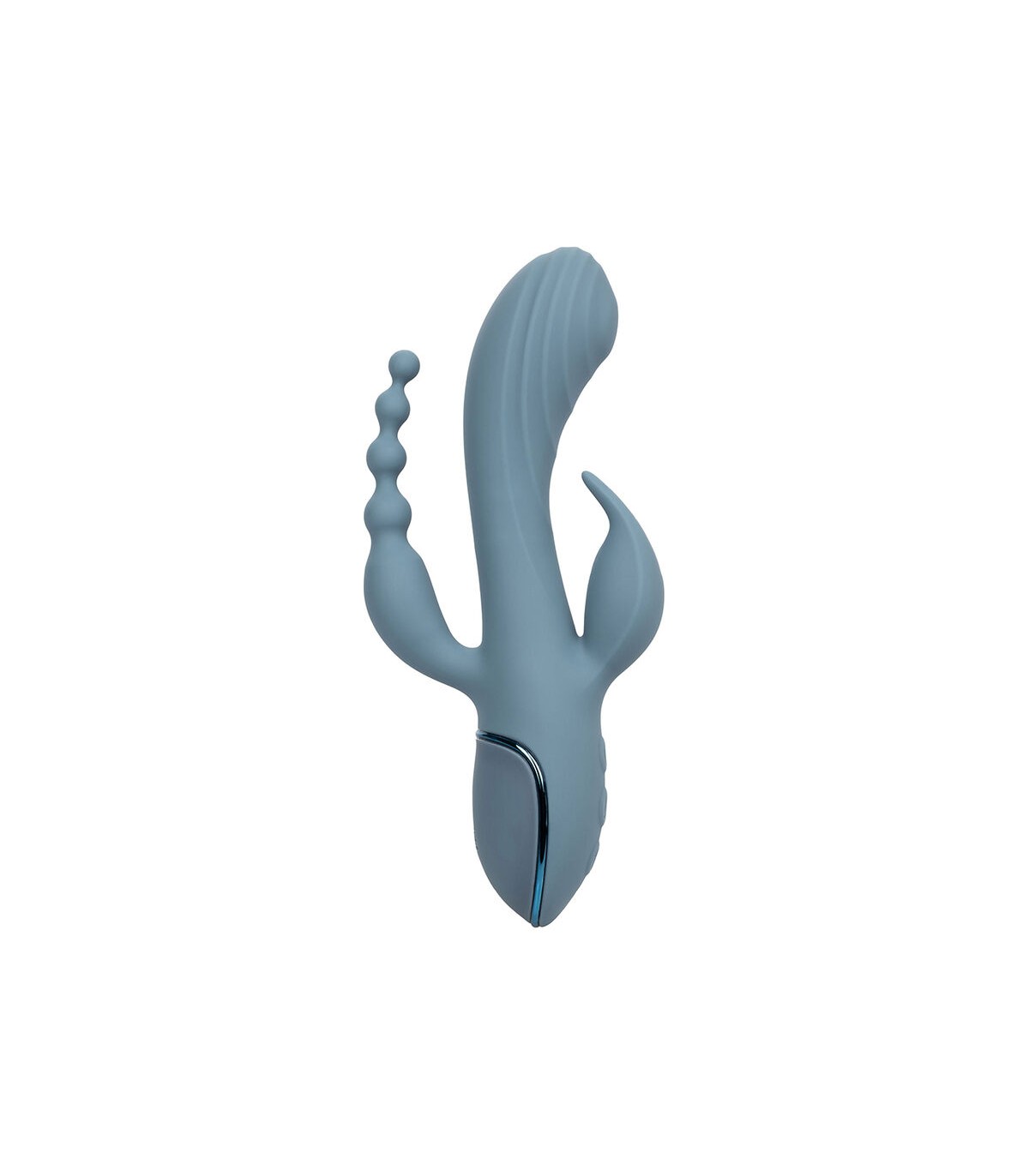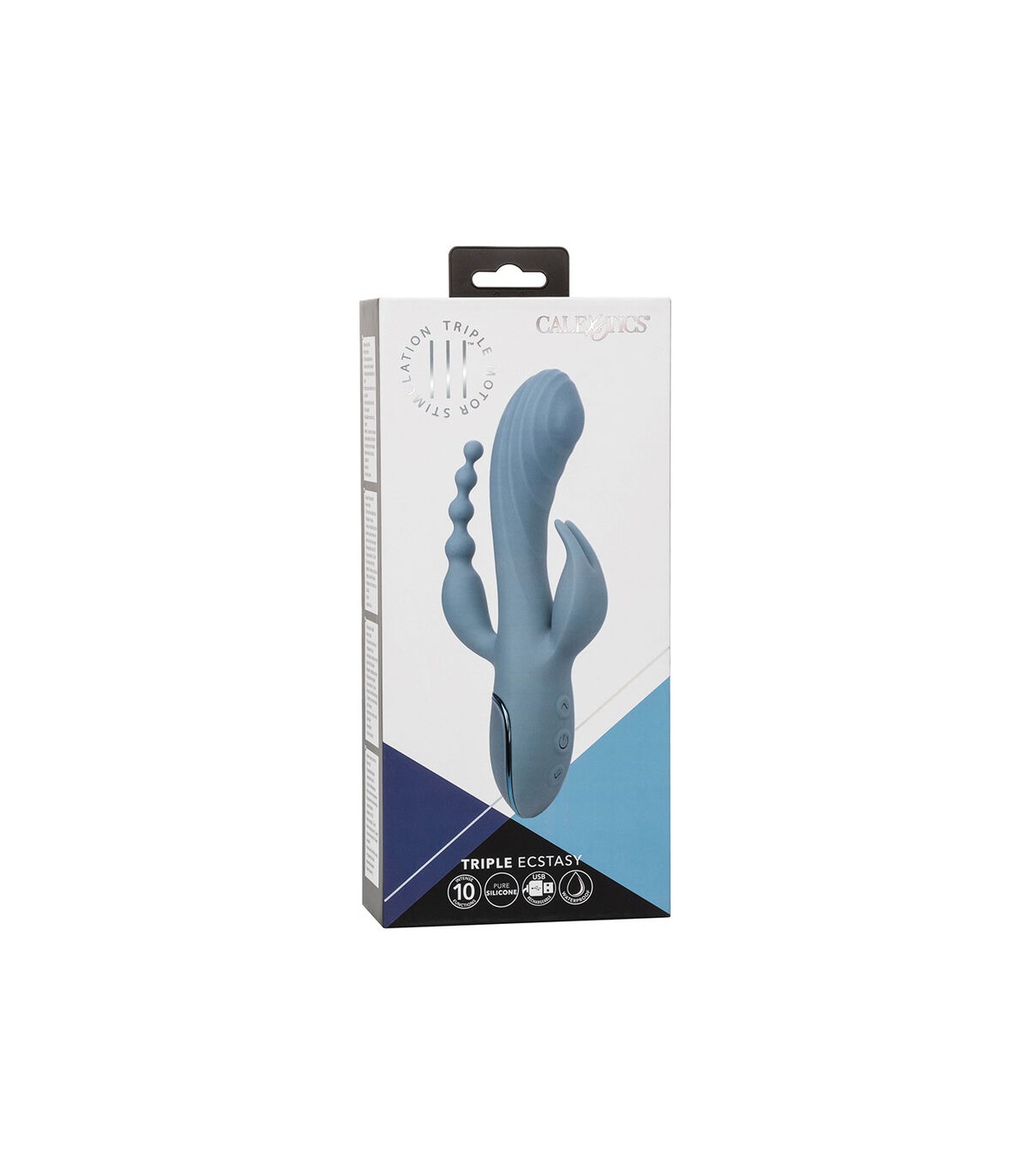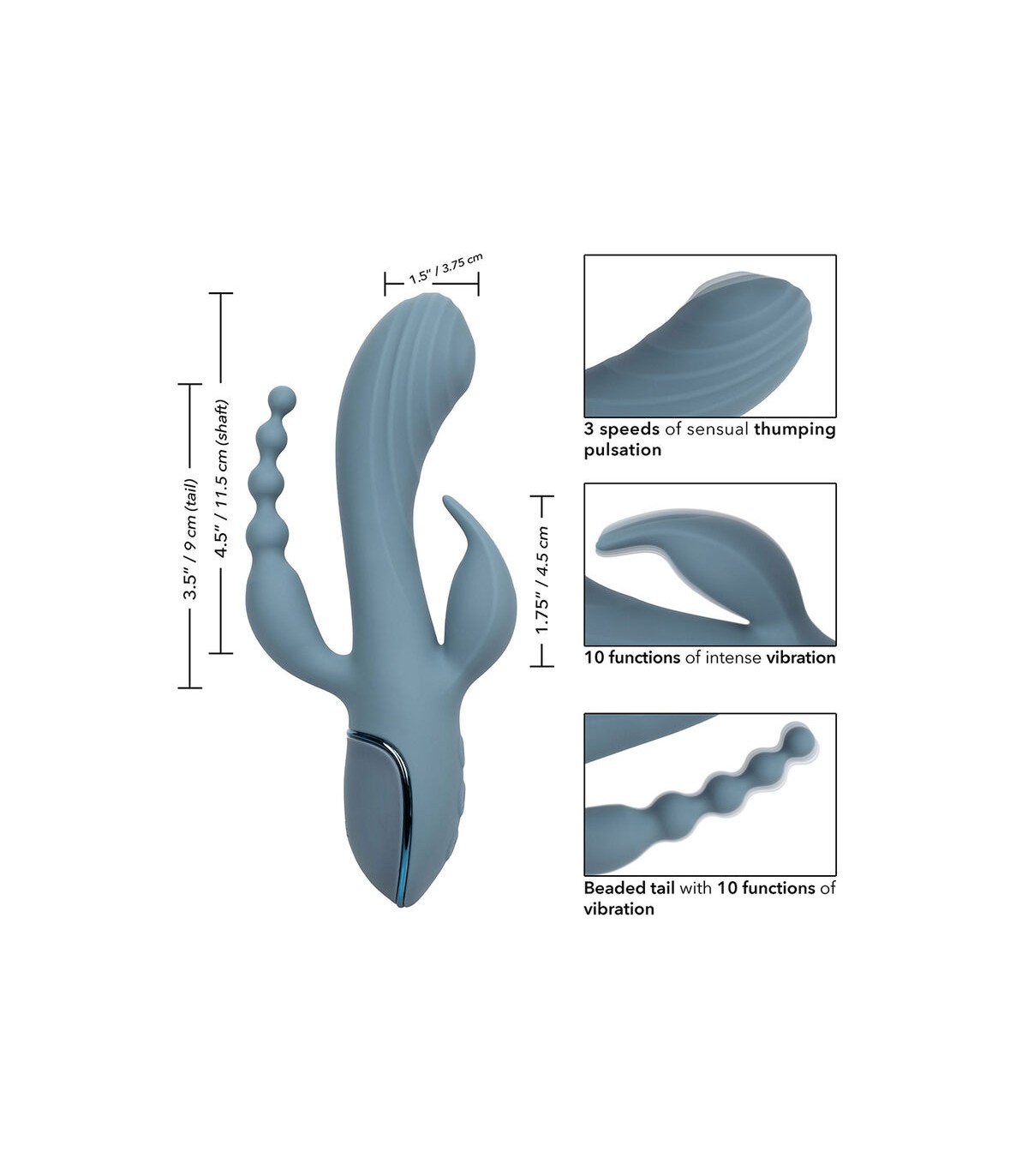 Disfrute de sus fantasías más locas con el perversamente poderoso III Triple Ecstasy. Experimente el placer como nunca antes con el potente masajeador recargable de triple acción con eje pulsante, cola con cuentas y estimulador contorneado. Este atrevido triple penetrador está hecho para satisfacer el placer. El potente masajeador de triple penetración utiliza 3 velocidades de pulsación en el eje sensualmente curvado para provocar el punto G y una penetración estremecedora. Mientras que una cola de cuentas emociona y un sensual juguete de conejo parpadea al ritmo de 10 potentes funciones de vibración independientes. La vibración rítmica y la cola brindan una estimulación espectacular, mientras que el eje contorneado se complace con pulsaciones profundas y retumbantes. Controla y personaliza tu juego de placer con las funciones controladas de forma independiente. Recargue el masajeador en 2,5 horas con el cable de carga USB incluido para disfrutar de 30 minutos de acción de alta velocidad o 90 minutos de estimulación de baja velocidad. Disfrute de un control sin frustraciones con el panel de control de 3 botones fácil de tocar y la función de bloqueo de seguridad para disfrutar del placer de viajar. El cuerpo prácticamente sin costuras y el puerto de carga autosellante le permiten llevar este versátil dispositivo impermeable a darse un chapuzón. La silicona premium es segura para el cuerpo, no tiene perfume ni ftalatos para mantener los puntos más sensibles felices y saludables.