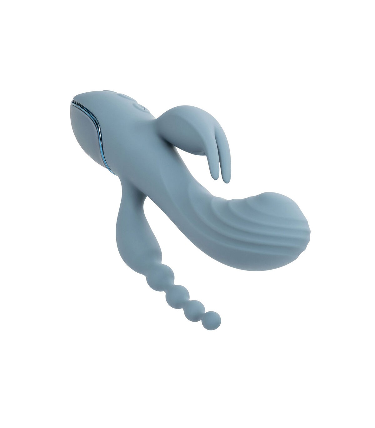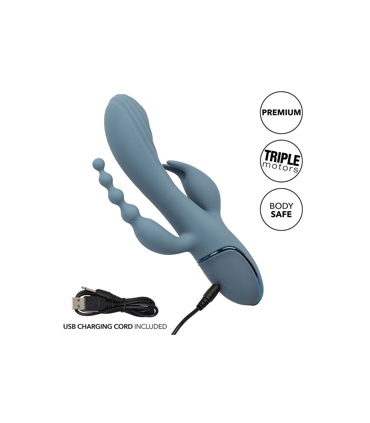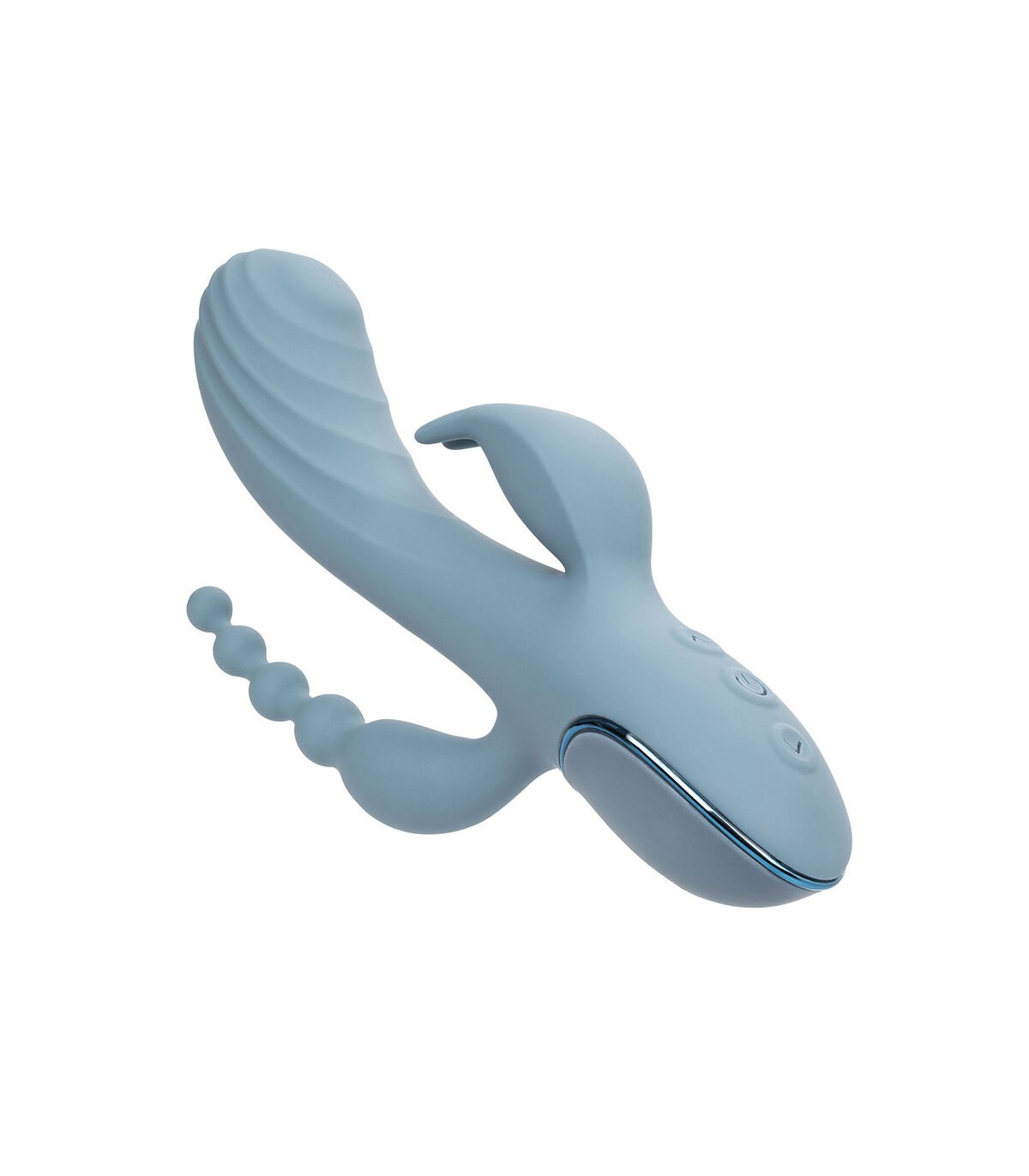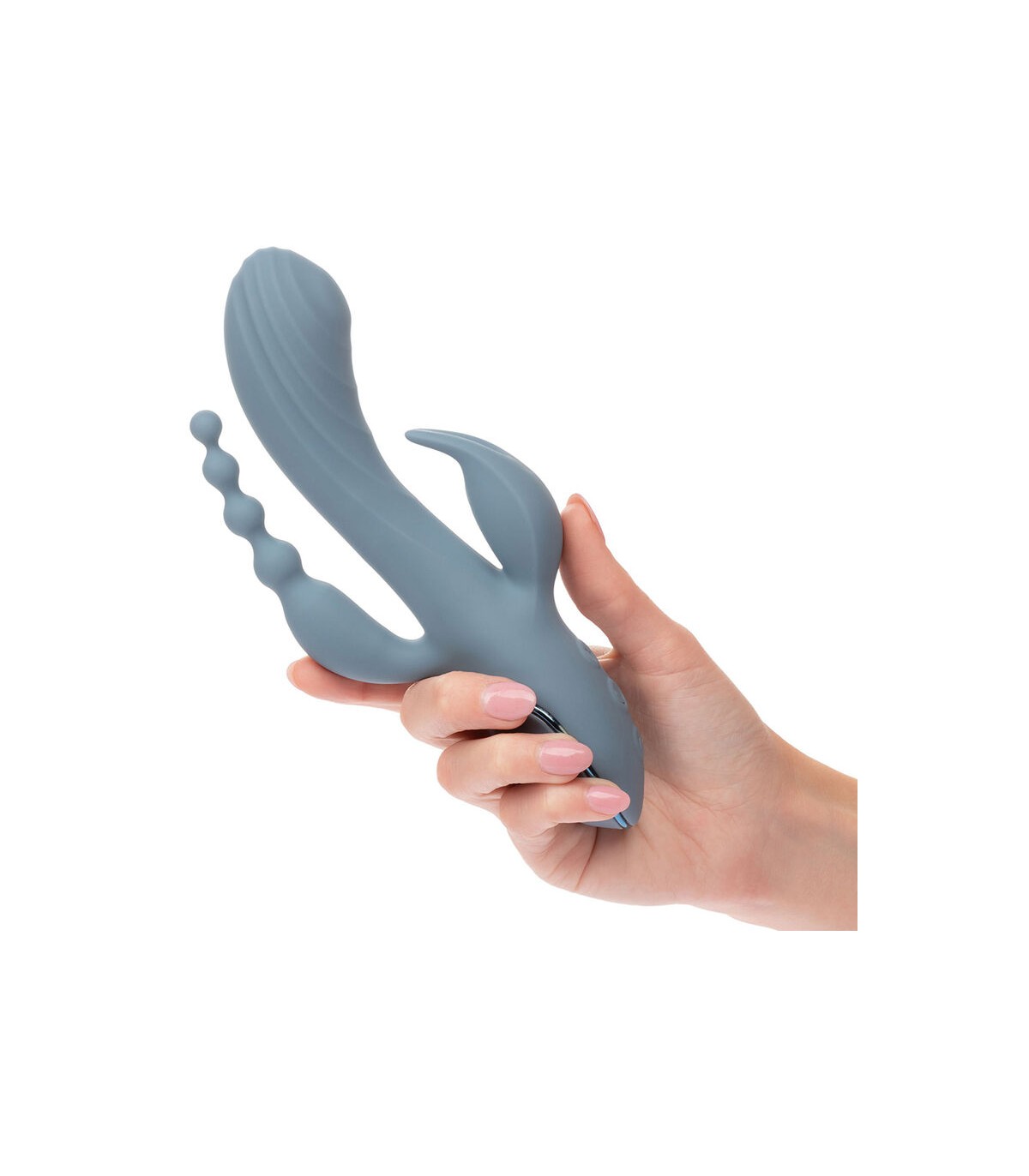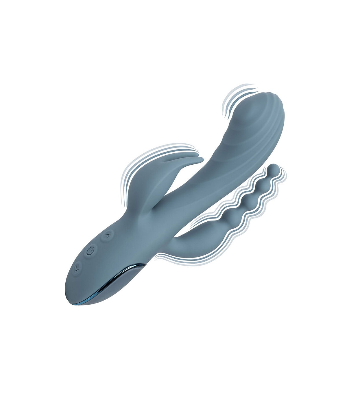 Disfrute de sus fantasías más locas con el perversamente poderoso III Triple Ecstasy. Experimente el placer como nunca antes con el potente masajeador recargable de triple acción con eje pulsante, cola con cuentas y estimulador contorneado. Este atrevido triple penetrador está hecho para satisfacer el placer. El potente masajeador de triple penetración utiliza 3 velocidades de pulsación en el eje sensualmente curvado para provocar el punto G y una penetración estremecedora. Mientras que una cola de cuentas emociona y un sensual juguete de conejo parpadea al ritmo de 10 potentes funciones de vibración independientes. La vibración rítmica y la cola brindan una estimulación espectacular, mientras que el eje contorneado se complace con pulsaciones profundas y retumbantes. Controla y personaliza tu juego de placer con las funciones controladas de forma independiente. Recargue el masajeador en 2,5 horas con el cable de carga USB incluido para disfrutar de 30 minutos de acción de alta velocidad o 90 minutos de estimulación de baja velocidad. Disfrute de un control sin frustraciones con el panel de control de 3 botones fácil de tocar y la función de bloqueo de seguridad para disfrutar del placer de viajar. El cuerpo prácticamente sin costuras y el puerto de carga autosellante le permiten llevar este versátil dispositivo impermeable a darse un chapuzón. La silicona premium es segura para el cuerpo, no tiene perfume ni ftalatos para mantener los puntos más sensibles felices y saludables.