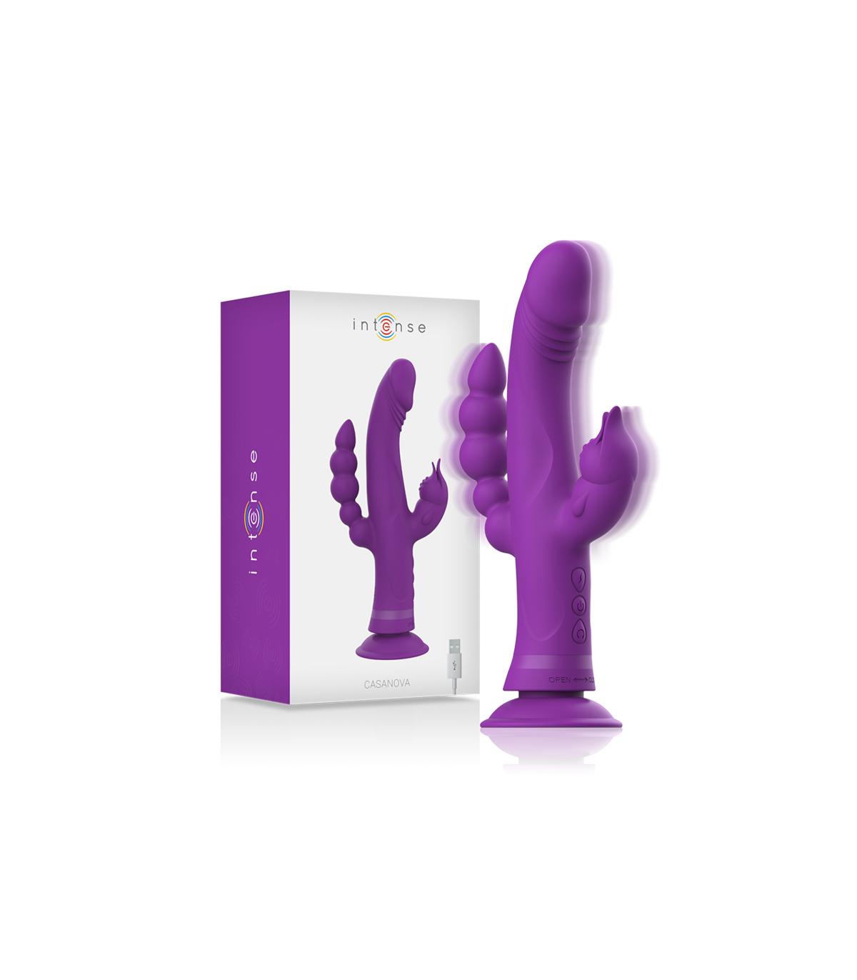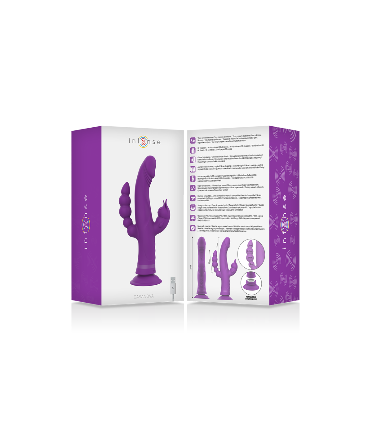 Ingeniosos vibradores unidos en un solo cuerpo de silicona. 3 Motores independientes ultra silenciosos y potentes. 30 modos de vibración, controlables desde 3 acciones de muy fácil manejo. Con su ventosa extra potente podrás adherirlo en cualquier superficie. Intense™ Casanova con Motor de vibraciones poderosas.