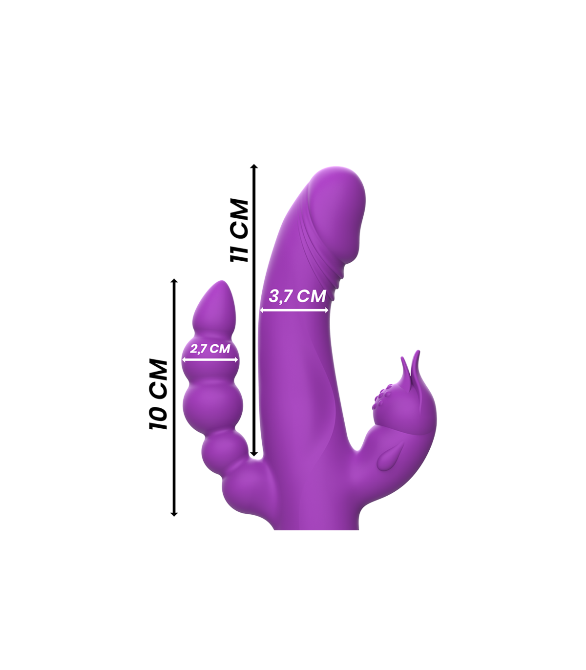 Vibrador triple placer con motores independientes unidos por un cuerpo e de silicona extra flexible y resistente, adecuado para múltiples posiciones. ¡Ideal para jugar en solitario y/o en pareja! Potentes y silenciosos motores con hasta 30 modos de vibración que se combinan con cada acción.