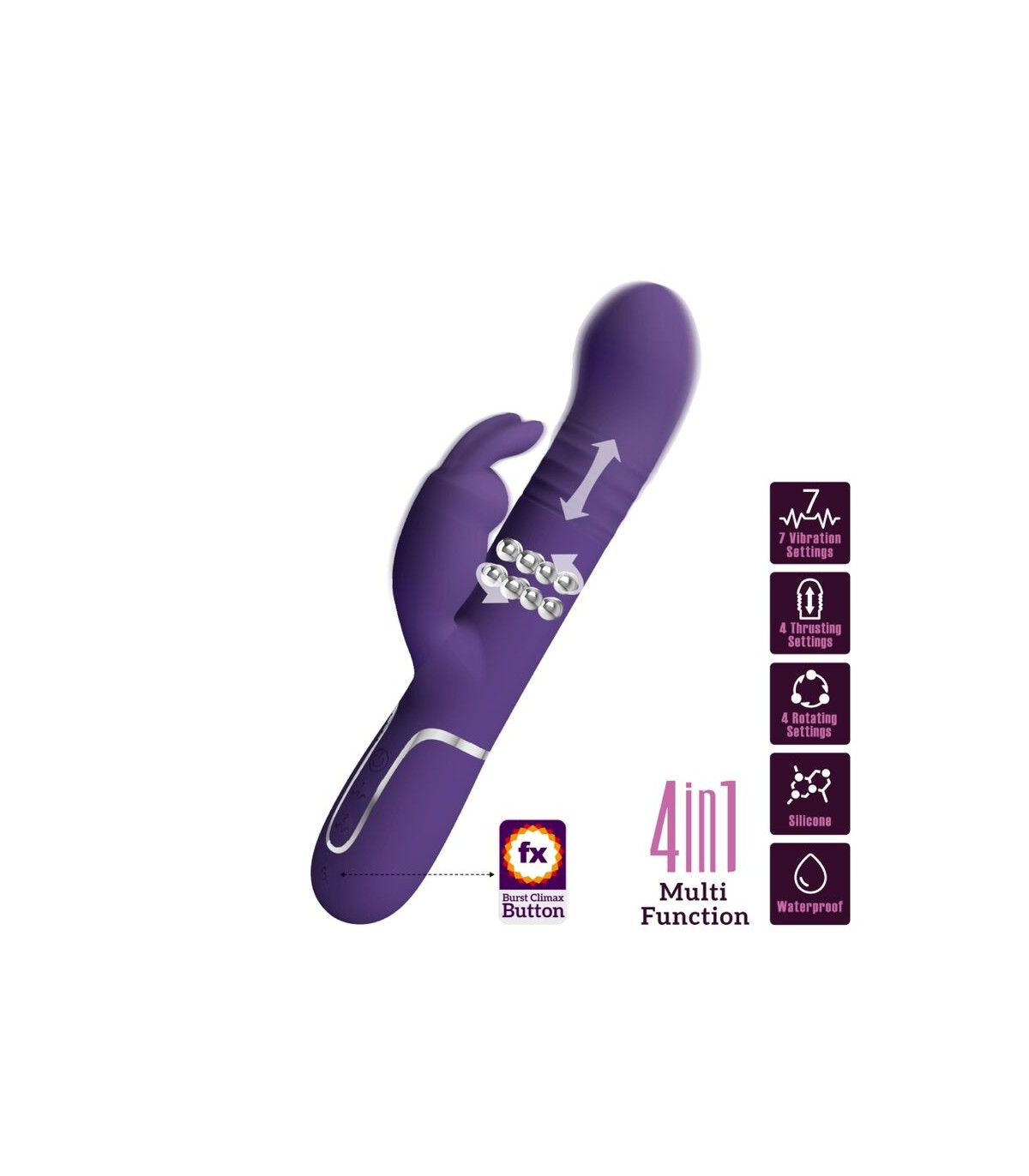 Diseñado para el máximo placer, quédate en la cama con el Vibrador Conejo Pretty Love. Con potentes motores gemelos, uno ubicado en la punta y el otro en el brazo externo, te prometemos que encontrarás tu vibración perfecta mientras 7 intensidades y ritmos de vibración te llevan a un poderoso clímax combinado. Con una sola fila de perlas rígidas que viajan hacia arriba y hacia abajo en un emocionante masaje íntimo, disfrute de las tres configuraciones de velocidad mientras frota constantemente su sensible punto dulce. Para mayor placer, presione el botón Burst Climax para explorar sus increíbles y trascendentales orgasmos.