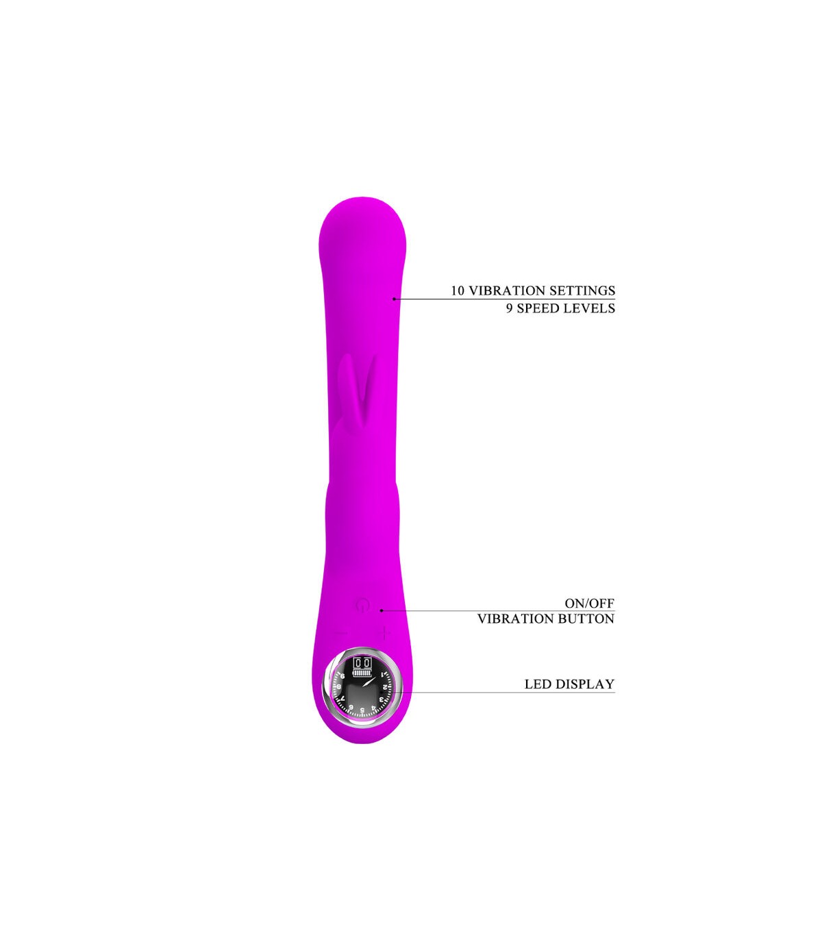 Este vibrador está diseñado con un eje curvo ideal para la estimulación del punto G, mientras que su forma sólida permite una mayor sensación al entrar y salir del cuerpo. El sólido vibrador de conejo externo permite al usuario obtener una estimulación del clítoris enfocada. Tiene una pantalla LCD digital fácil de usar que muestra la configuración y el nivel de la batería. Es el complemento perfecto para el dormitorio de las parejas que disfrutan de un contacto vibratorio intenso, sensual y pleno.