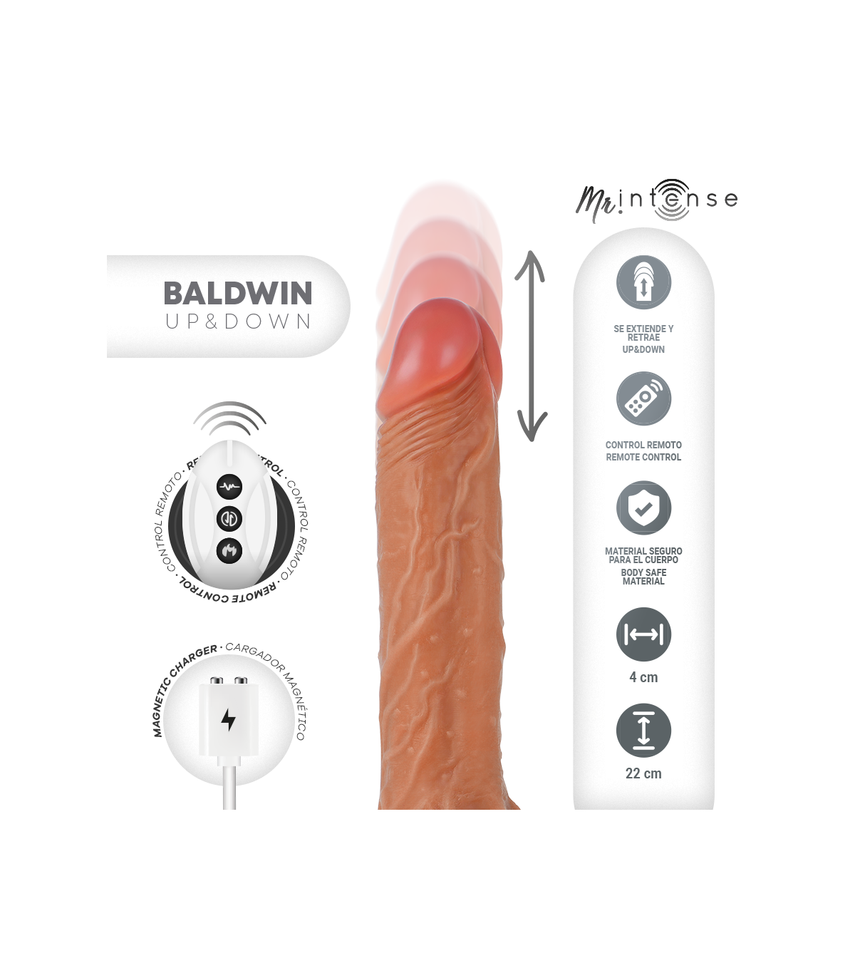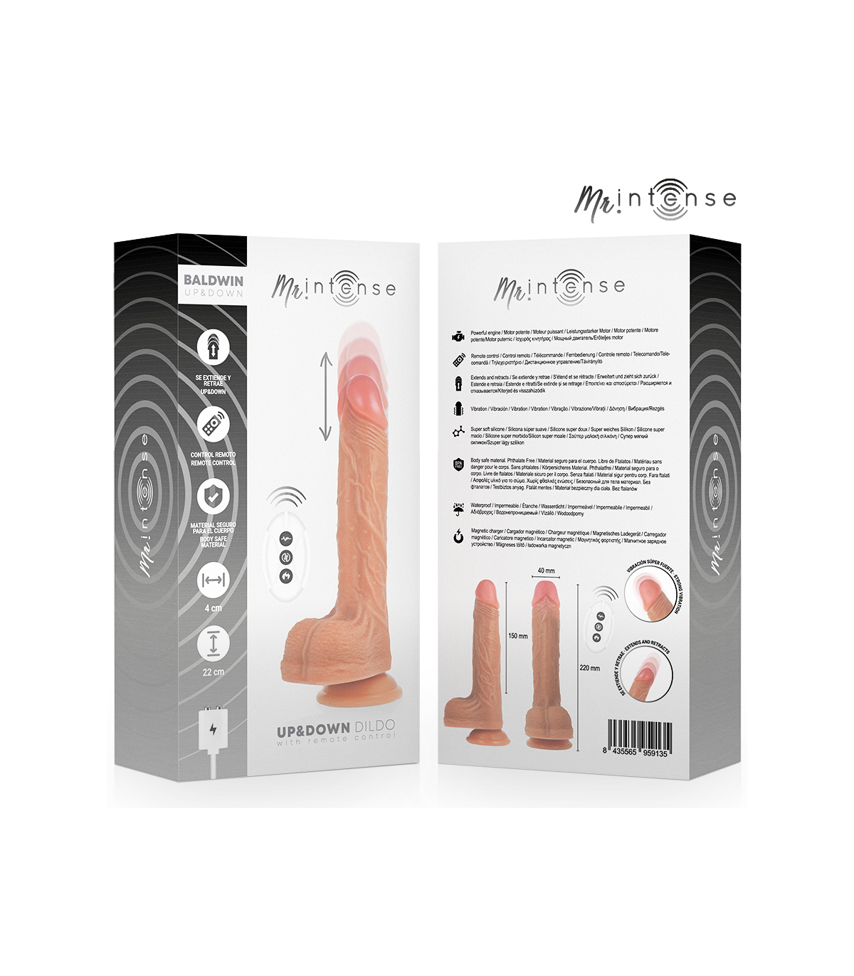 Déjate llevar por una experiencia intensa y realista con BALDWIN, el dildo estrella de la colección MR INTENSE. Diseñado para los amantes del placer potente y profundo, este vibrador realístico combina una estética hiperrealista con una mecánica interna que simula el movimiento natural del empuje vertical (Up & Down) para sensaciones completamente envolventes. Con un eje flexible de 22 cm de largo total y 15 cm insertables, y un diámetro medio de 4 cm, BALDWIN ofrece una presencia sólida y satisfactoria sin comprometer la comodidad. Su cuerpo está cubierto de silicona súper suave de alta calidad, segura para el cuerpo y con un tacto sedoso que imita la piel real.