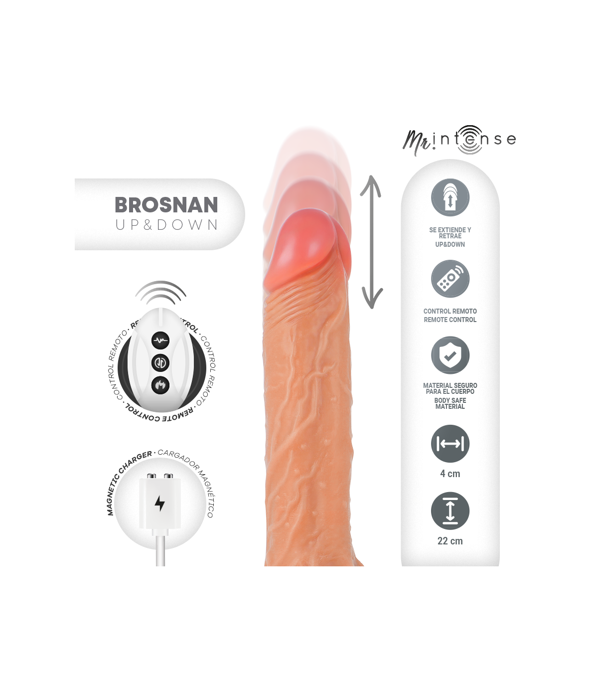 Déjate llevar por una experiencia intensa y realista con BROSNAN, el dildo estrella de la colección MR INTENSE. Diseñado para los amantes del placer potente y profundo, este vibrador realístico combina una estética hiperrealista con una mecánica interna que simula el movimiento natural del empuje vertical (Up & Down) para sensaciones completamente envolventes. Con un eje flexible de 22 cm de largo total y 15 cm insertables, y un diámetro medio de 4 cm, BROSNAN ofrece una presencia sólida y satisfactoria sin comprometer la comodidad. Su cuerpo está cubierto de silicona súper suave de alta calidad, segura para el cuerpo y con un tacto sedoso que imita la piel real.
