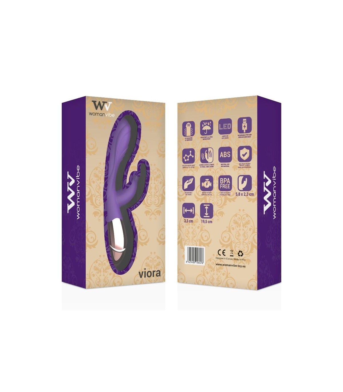 Womanvibe Viora, el vibrador Rabbit tiene un diseño único que le convierte en un auténtico regalo para la vista. Diseño curvado para una estimulación del punto G, estimulador rabbit clitorial, relieve que proporciona un placer adicional. Completamente elegante en color Gold y Lila, este vibrador recargable está fabricado en silicona suave y sedosa respetuosa con el medio ambiente libre de falatos respetuosa con tu piel.