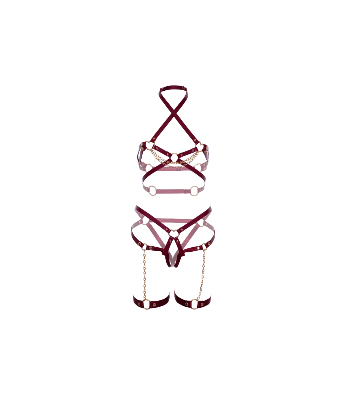 Desbloquea tus sueños más salvajes con nuestro tentador top tipo sujetador con arnés de cuero vegano con aro en forma de corazón y tachuelas; completo con una cadena de seducción. Invita a la tentación con la liga hasta el muslo a juego para hacer alarde de tu deseo con una atrevida combinación de clase y vanguardia. ¡Explora lo irresistible!