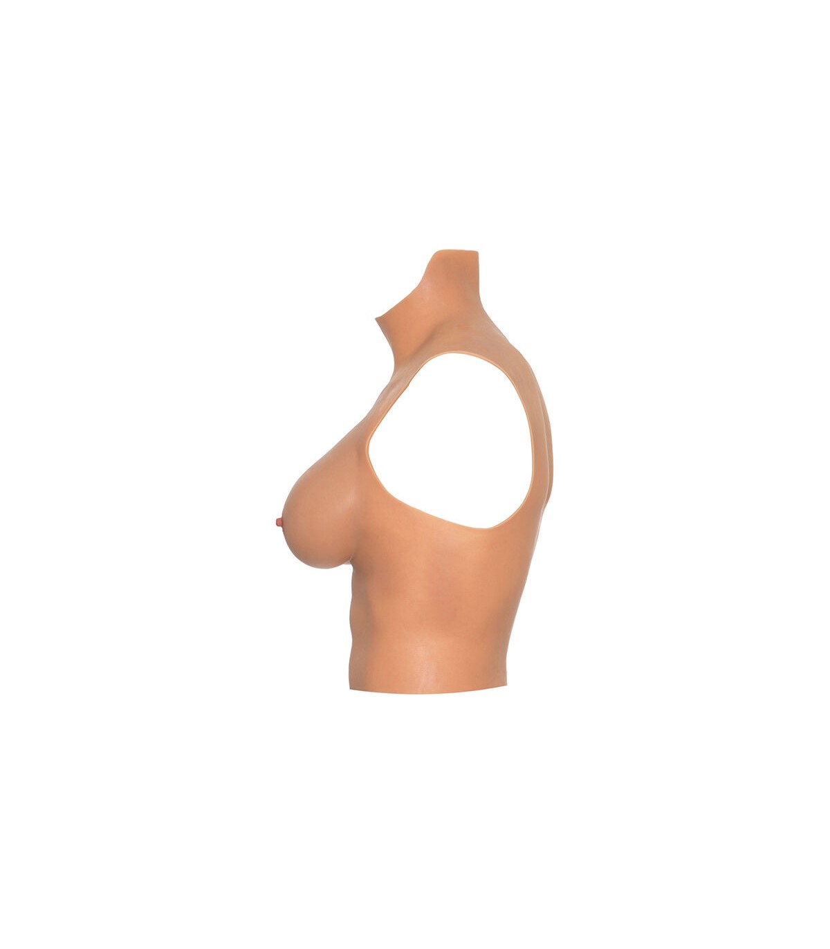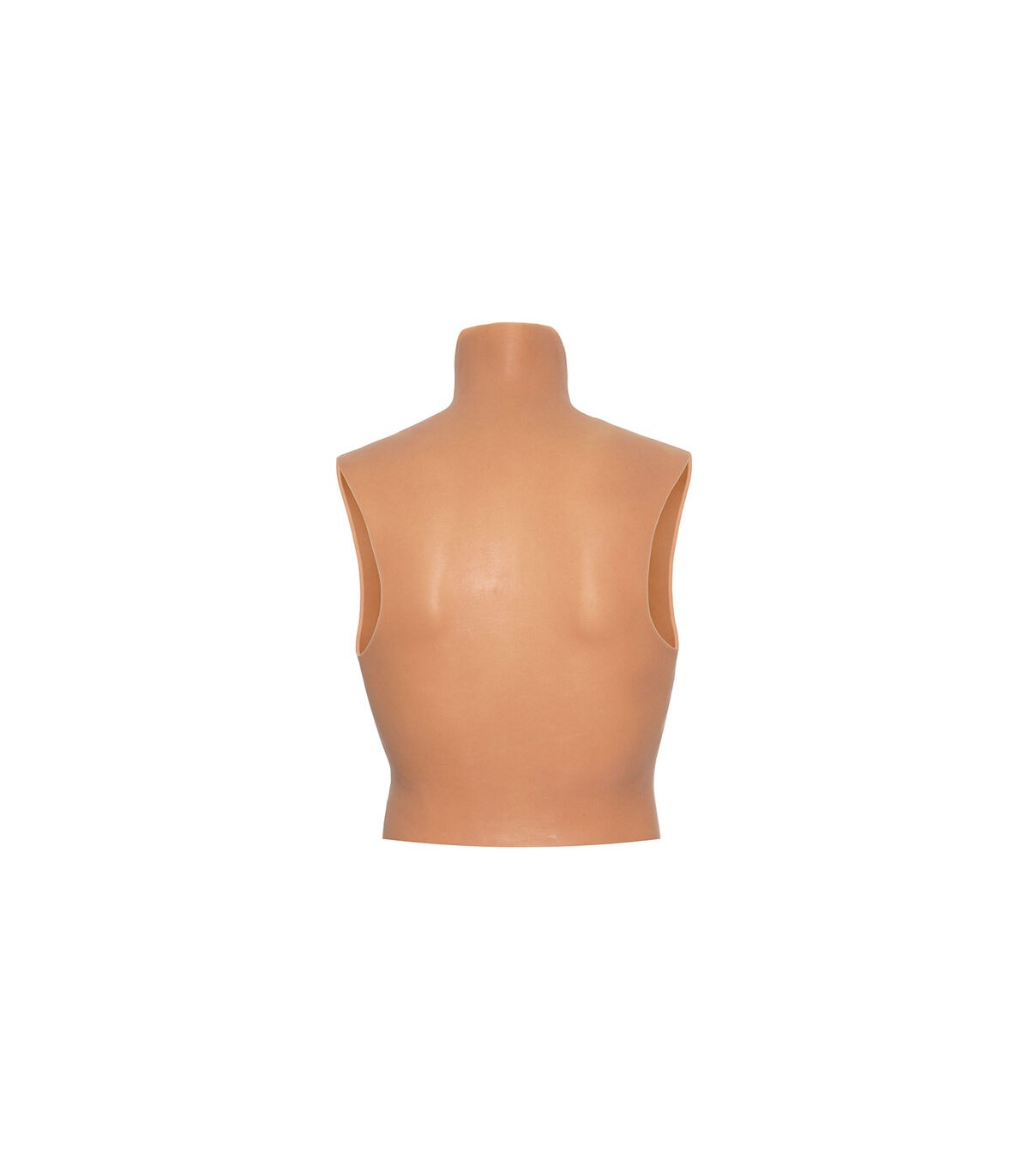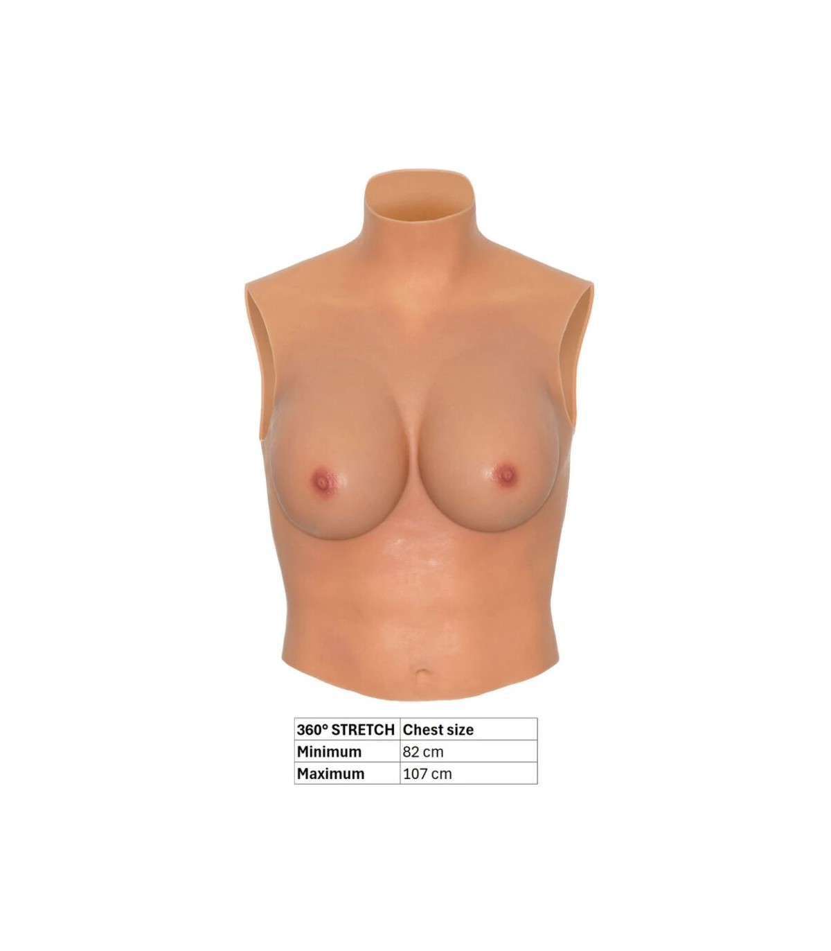 Fabricada en silicona 100 % pura, esta camiseta destaca por su tacto suave, su flexibilidad y su resistencia. Incorpora pechos voluminosos y blandos, cuidadosamente modelados para ofrecer una sensación natural al tacto, junto con pezones realistas que aportan un alto nivel de detalle y autenticidad. El cuello alto añade estabilidad y un ajuste seguro, manteniendo la prenda en su lugar durante el uso.