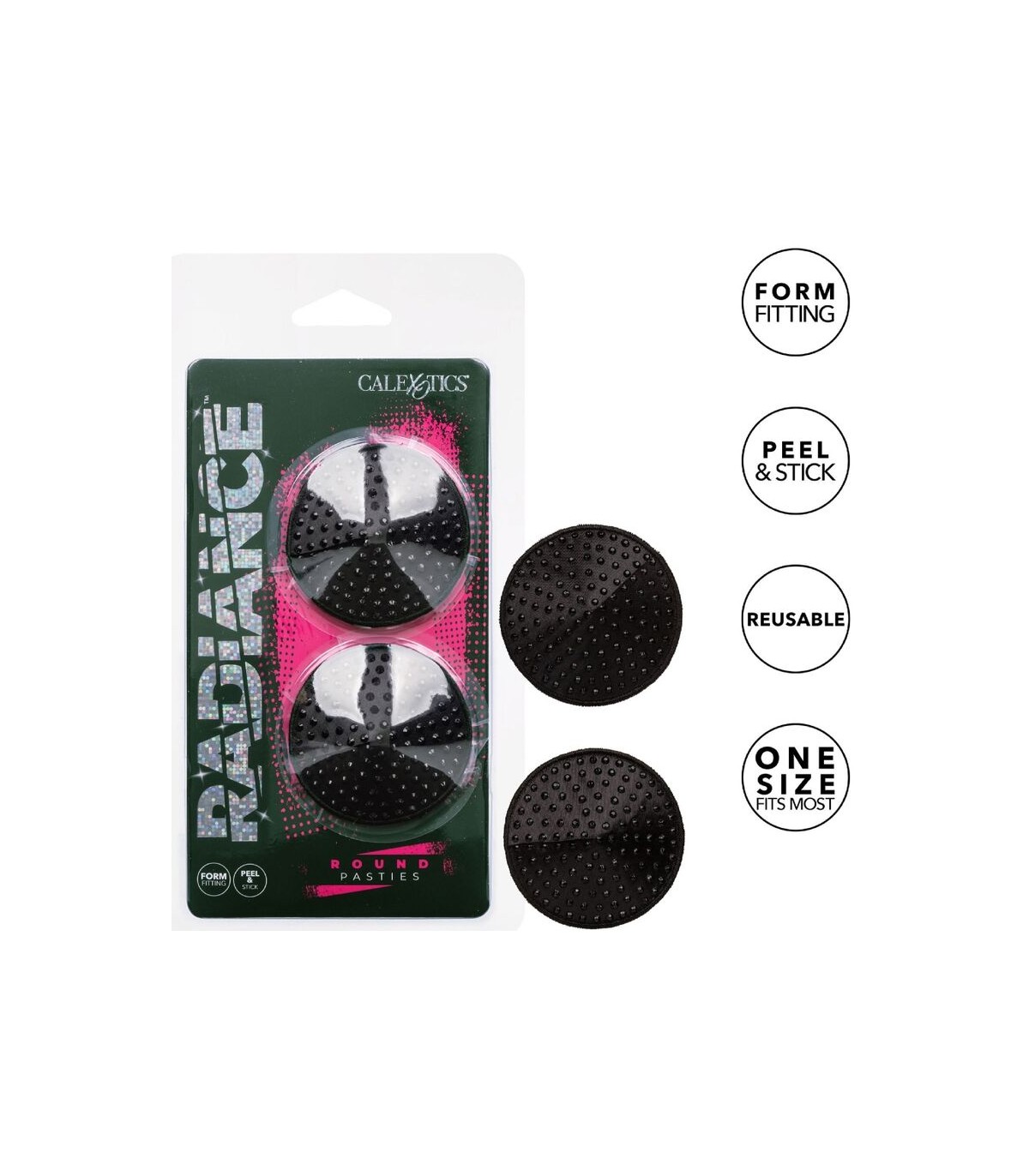 Envuelve tus golosinas en glamour con las deslumbrantes pezoneras Radiance redondas. Estas pezoneras reutilizables están listas para la fiesta con detalles de gemas brillantes, una cinta adhesiva fácil de despegar y pegar y un diseño que se ajusta a la forma.