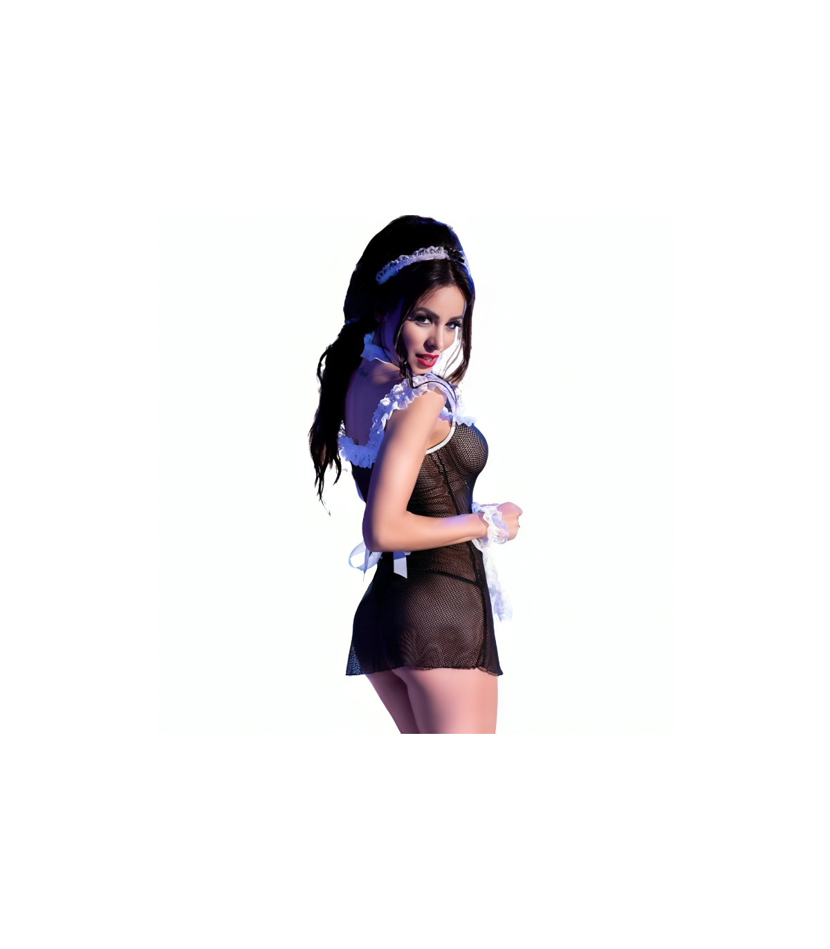 El vestido y el delantal son las piezas principales del conjunto y están confeccionados en una delicada malla transparente que envuelve sensualmente el cuerpo. Están decorados con encaje blanco y lazos para añadir un toque de feminidad y sensualidad. El material es elástico y ajustado para realzar las curvas y resaltar la figura. La diadema es un accesorio característico del uniforme de sirvienta y completa el look con un toque coqueto y juguetón. Los puños son otro detalle característico del uniforme de sirvienta. Pueden ser adornos de encaje que se ajustan alrededor de las muñecas para añadir un toque de elegancia y sofisticación al conjunto.