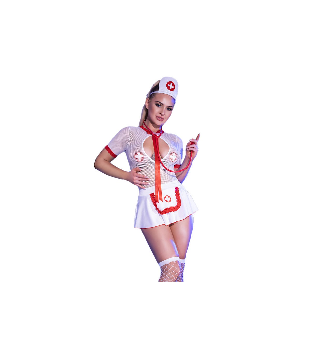 CR 4365 el conjunto de enfermera está completo y listo para ser usado en fiestas de disfraces, eventos temáticos o cualquier ocasión donde se busque un look médico sensual y auténtico.