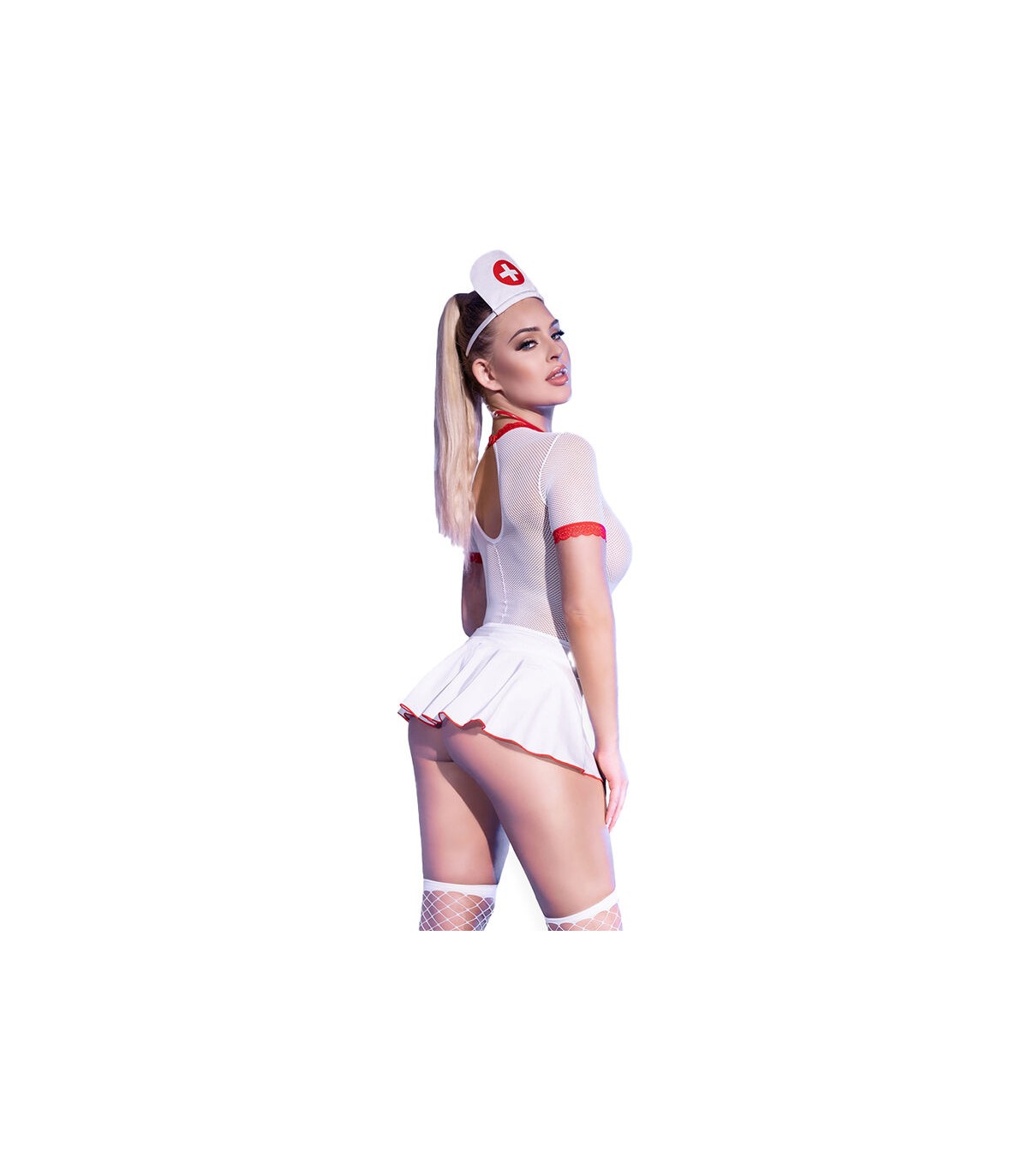 El body es una pieza central del conjunto y está diseñado para evocar el uniforme de una enfermera. La falda con delantal es otra parte esencial del conjunto. La falda suele ser corta y plisada, mientras que el delantal puede estar diseñado con detalles médicos, como bolsillos o emblemas de cruz roja, para completar el look de enfermera.