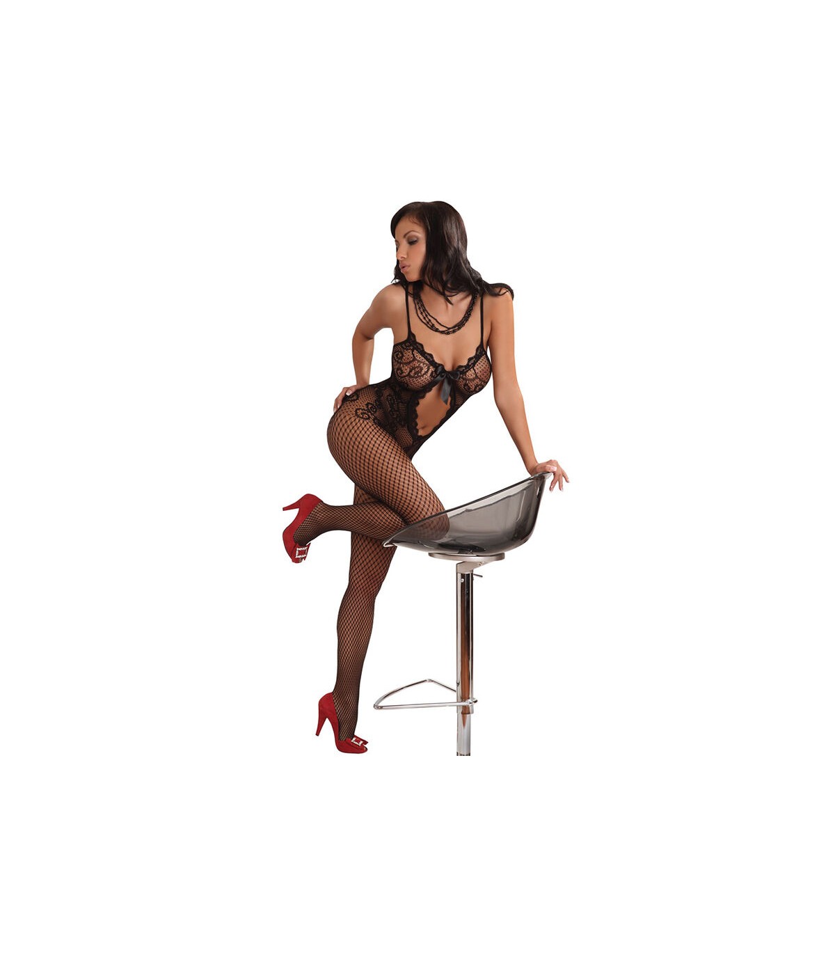 Precioso body con un original motivo floral en la parte superior y bajo de rejilla. El escote está decorado con un lazo de satén y un elegante encaje alrededor de un intrigante corte en forma de lágrima. El conjunto resalta perfectamente la belleza del cuerpo femenino.