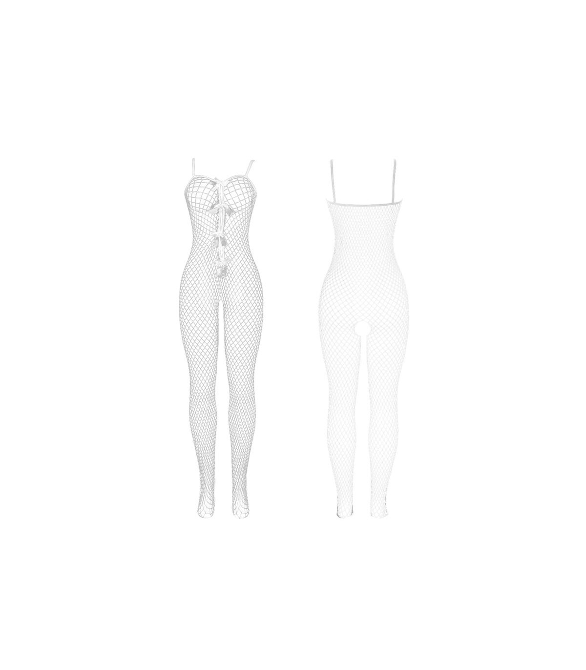 • Estilo: Bodystocking blanco de rejilla con diseño crotchless (entrepierna abierta) y detalles de lazos.