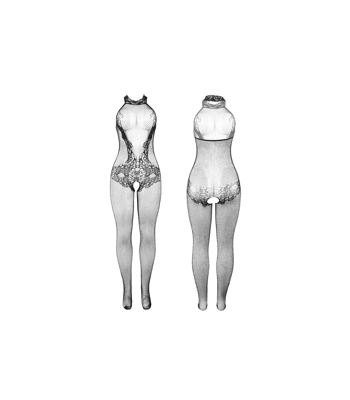 • Estilo: Bodystocking negro de rejilla y encaje con cuello alto y diseño crotchless (entrepierna abierta).