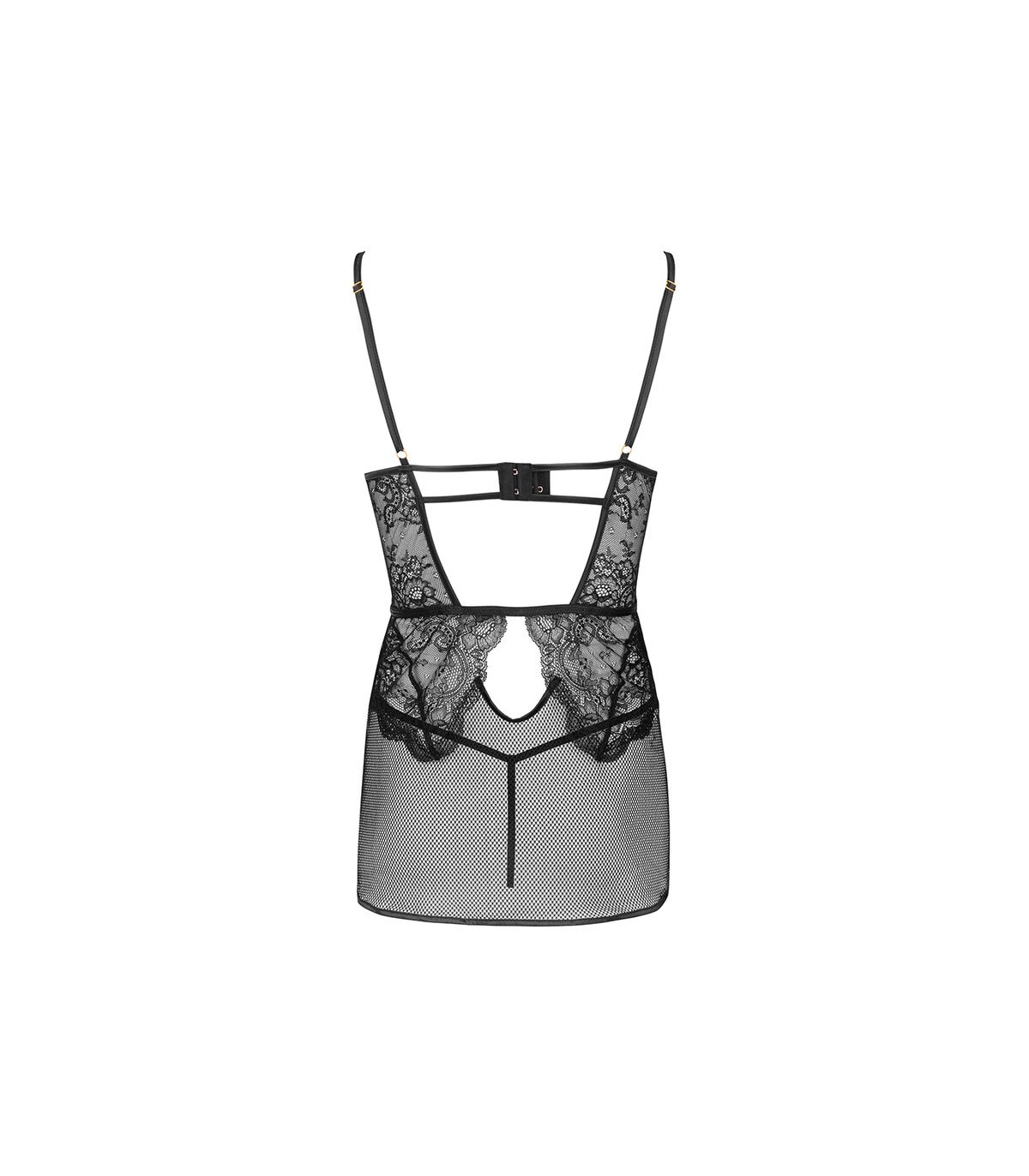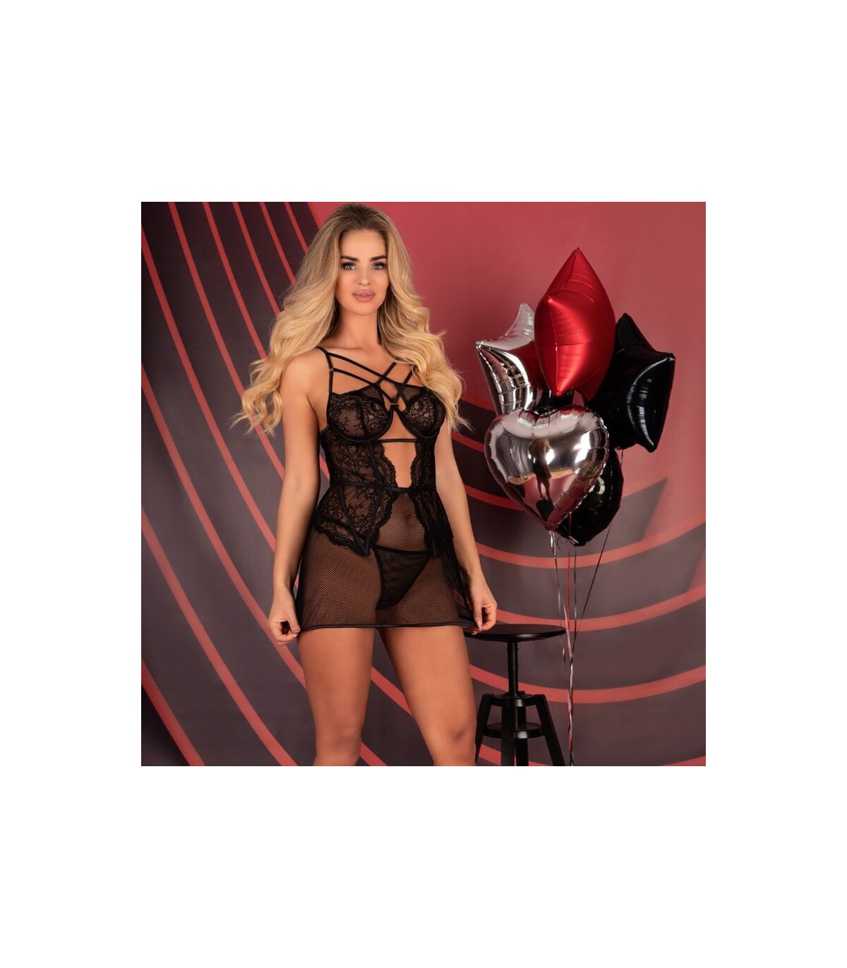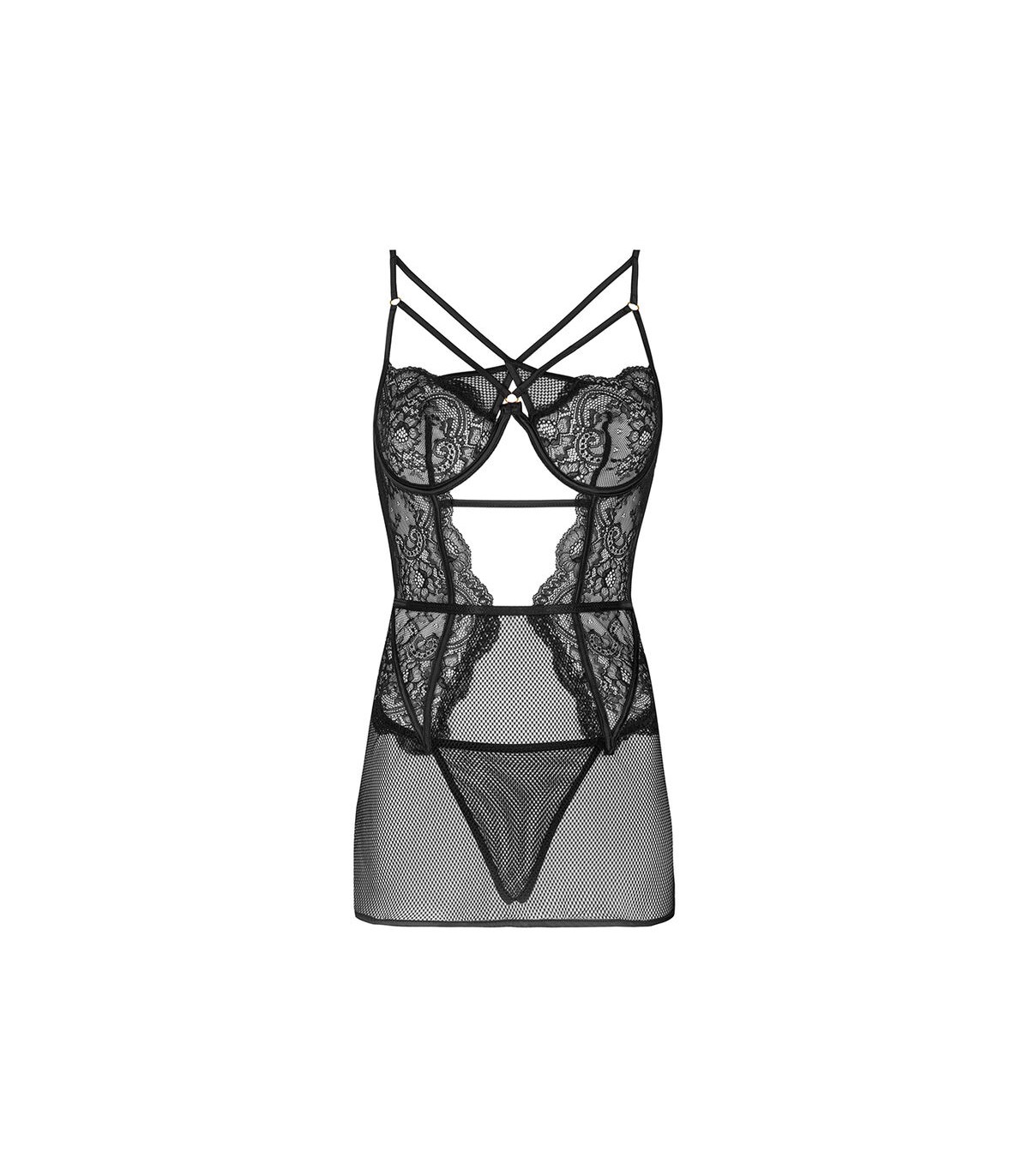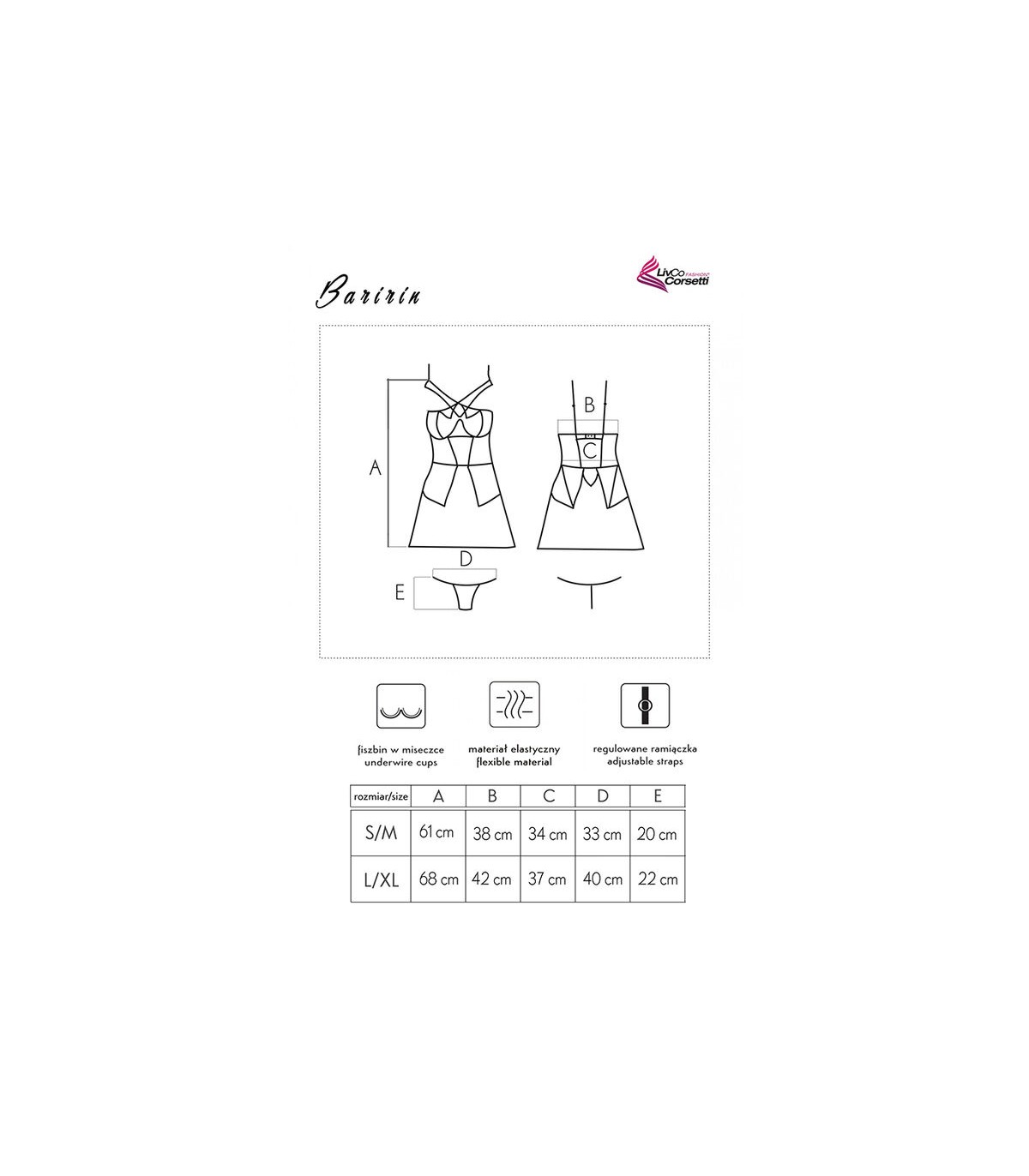 El modelo Baririn Rissarin Collection es un conjunto compuesto por camiseta y tanga en un atemporal color negro. El conjunto se basa en una combinación sensual de encaje elegante y malla misteriosa, que al mismo tiempo cubre el cuerpo y atrae la atención. El tanga del juego tiene un corte clásico, que es sólo un fondo para un camisón fenomenal con un corte sofisticado. El modelo Baririn Rissarin Collection destaca gracias a las rayas decorativas en el escote y los recortes debajo del busto y en la espalda. La camiseta, que revela trozos de piel desnuda, enciende los sentidos y despierta el deseo.