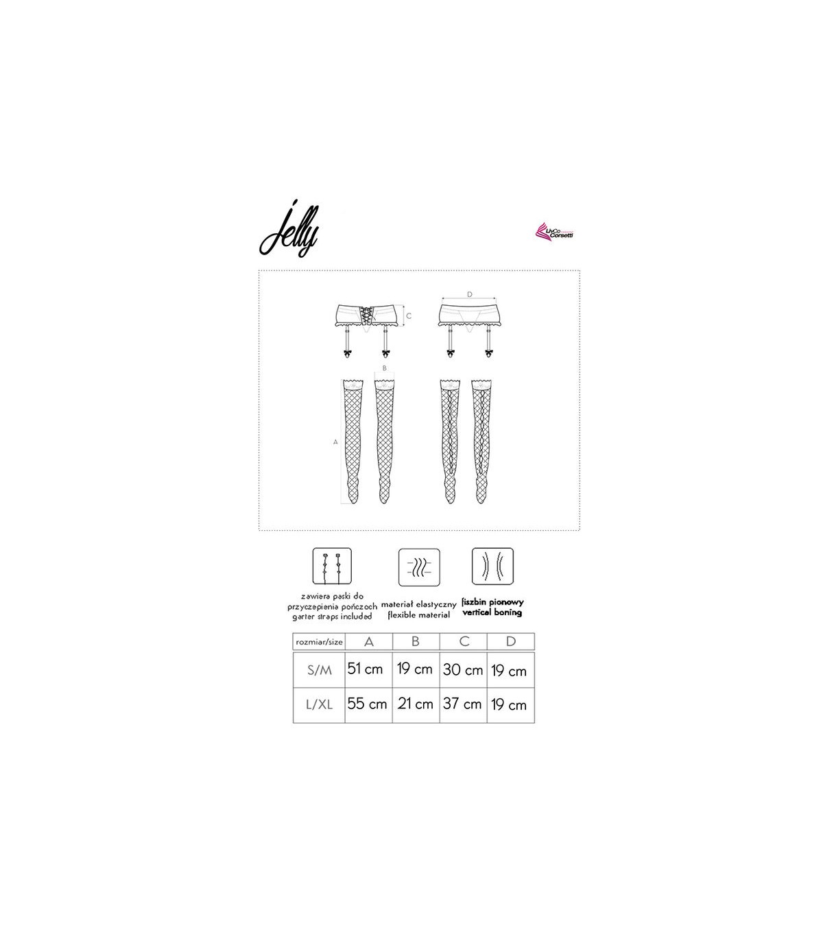 El liguero Jelly es un sensual conjunto de ropa interior de la colección LivCO Corsetti Fashion. Incluye liguero con medias. Todo está acabado en un elegante color negro. El liguero está hecho de encaje fino. Cubre el cuerpo desde las caderas hasta la cintura. Su anchura hace que parezca muy impresionante y moldea ópticamente la figura. El cinturón también tiene costuras verticales que le dan un carácter depredador y lo estilizan ópticamente. Los tentadores adornos en forma de inserciones diagonales de material brillante están adornados con elementos decorativos plateados. La parte delantera del liguero se cierra con cómodos ganchos. La atractiva espalda con abertura por encima de las nalgas está equipada con un cordón tipo corsé. Las medias de rejilla con malla grande se sujetan a la cintura con tirantes finos y ajustables. Su parte superior está decorada con encaje con adorno floral. El conjunto está fabricado en material flexible que se adapta a la forma del cuerpo y realza la figura.