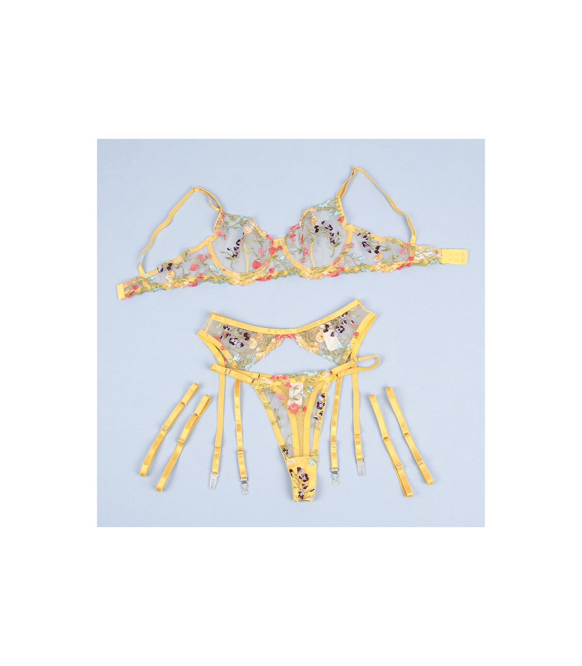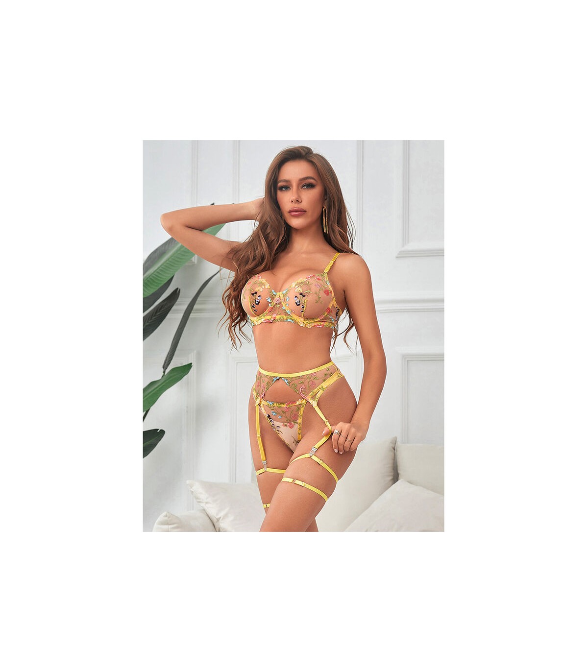 SUBBLIME - 954345 SUJETADOR + TANGA + LIGUEROS DISEÑO FLORAL AMARILLO S/M