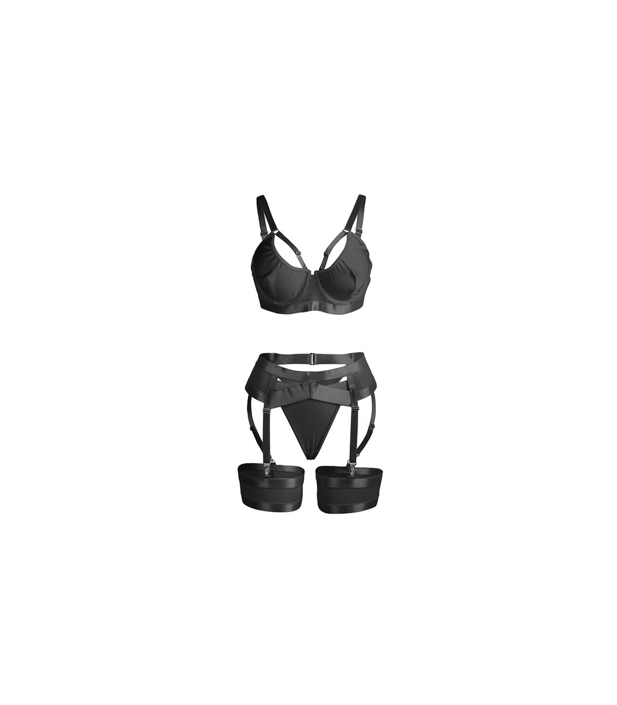 El diseño combina elementos de bondage con detalles contemporáneos para lograr un look audaz y seductor. El sujetador incluye correas ajustables y detalles estratégicos que resaltan el busto, mientras que el portaligas añade un toque provocativo y femenino, estilizando la silueta. Todo el conjunto está acentuado con un elegante color negro, clásico y versátil, que evoca misterio y sofisticación.