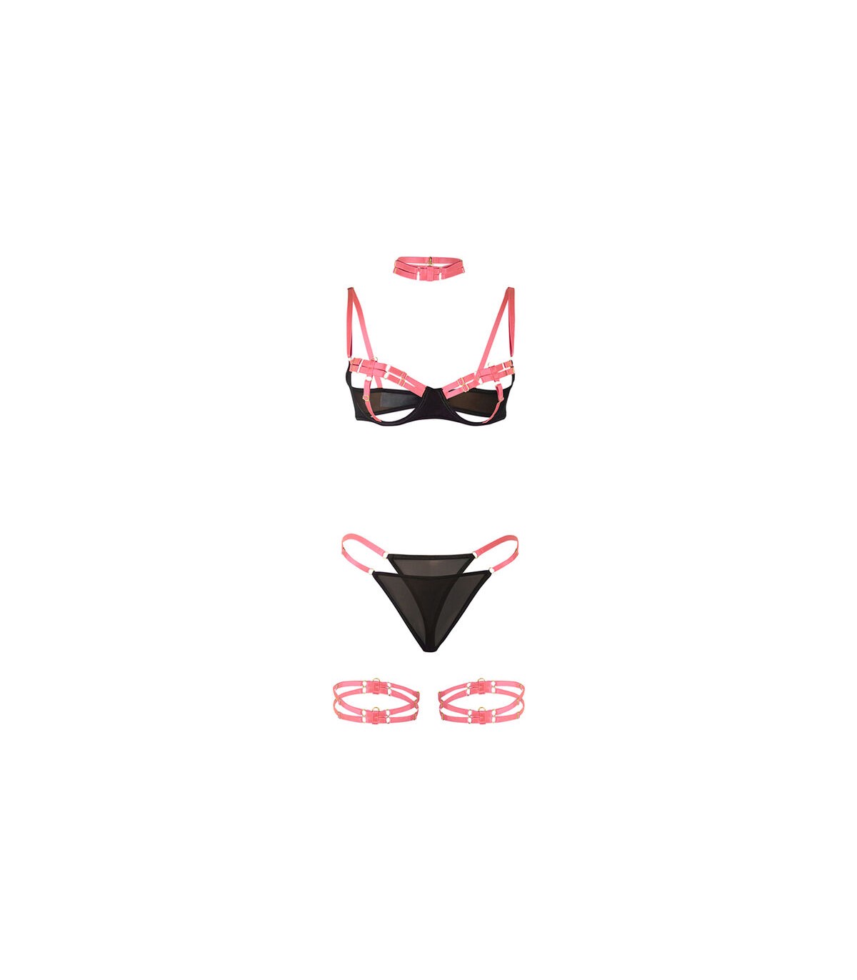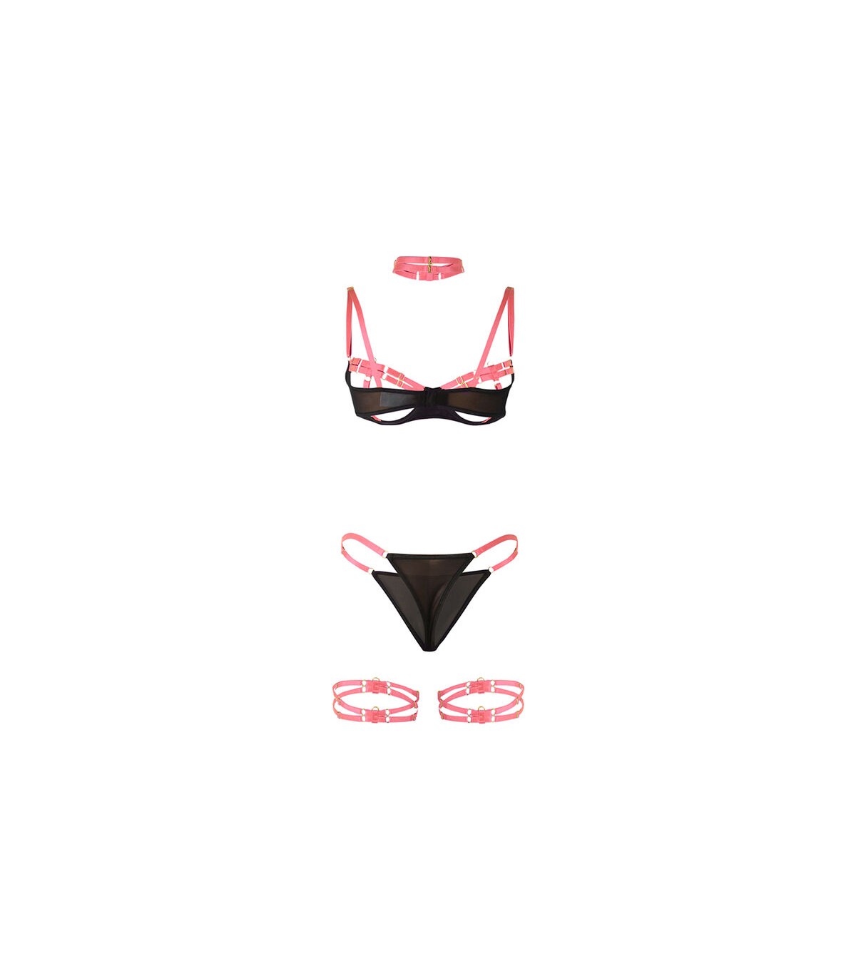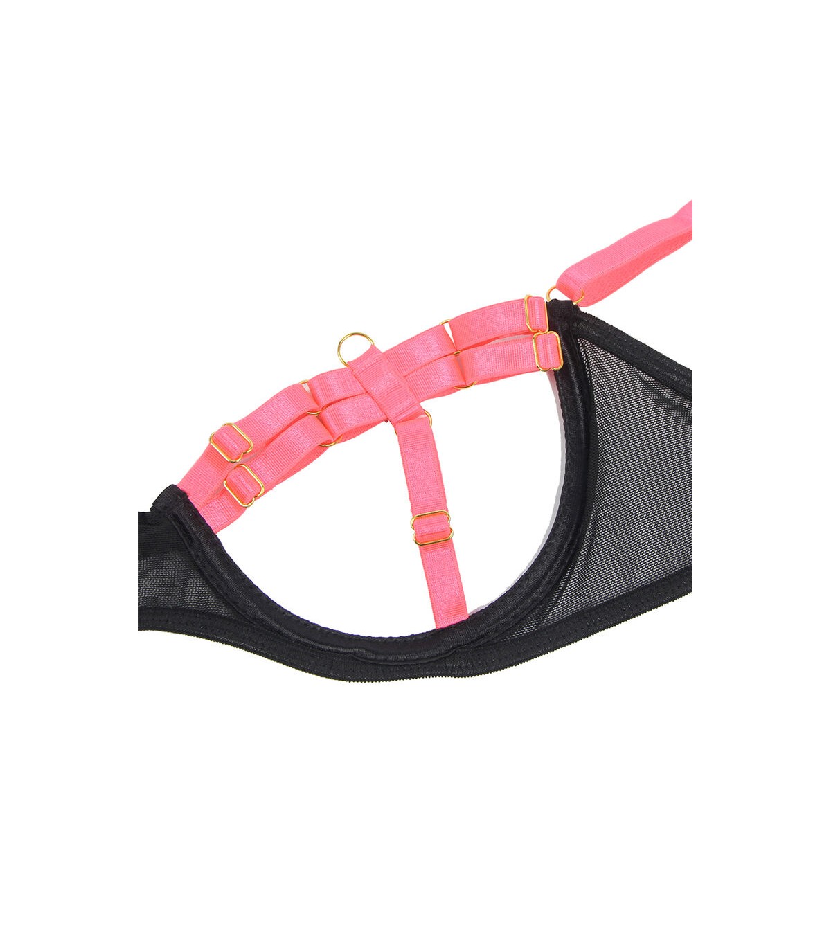 Confeccionado con materiales de alta calidad (95% poliéster y 5% elastano/spandex), este conjunto ofrece una textura suave, gran elasticidad y un ajuste perfecto a las curvas de tu cuerpo. El sujetador presenta un diseño de tiras cruzadas que enmarca y realza el busto, mientras que las transparencias y el contraste de colores en tonos de rosa añaden un aire romántico y sofisticado.