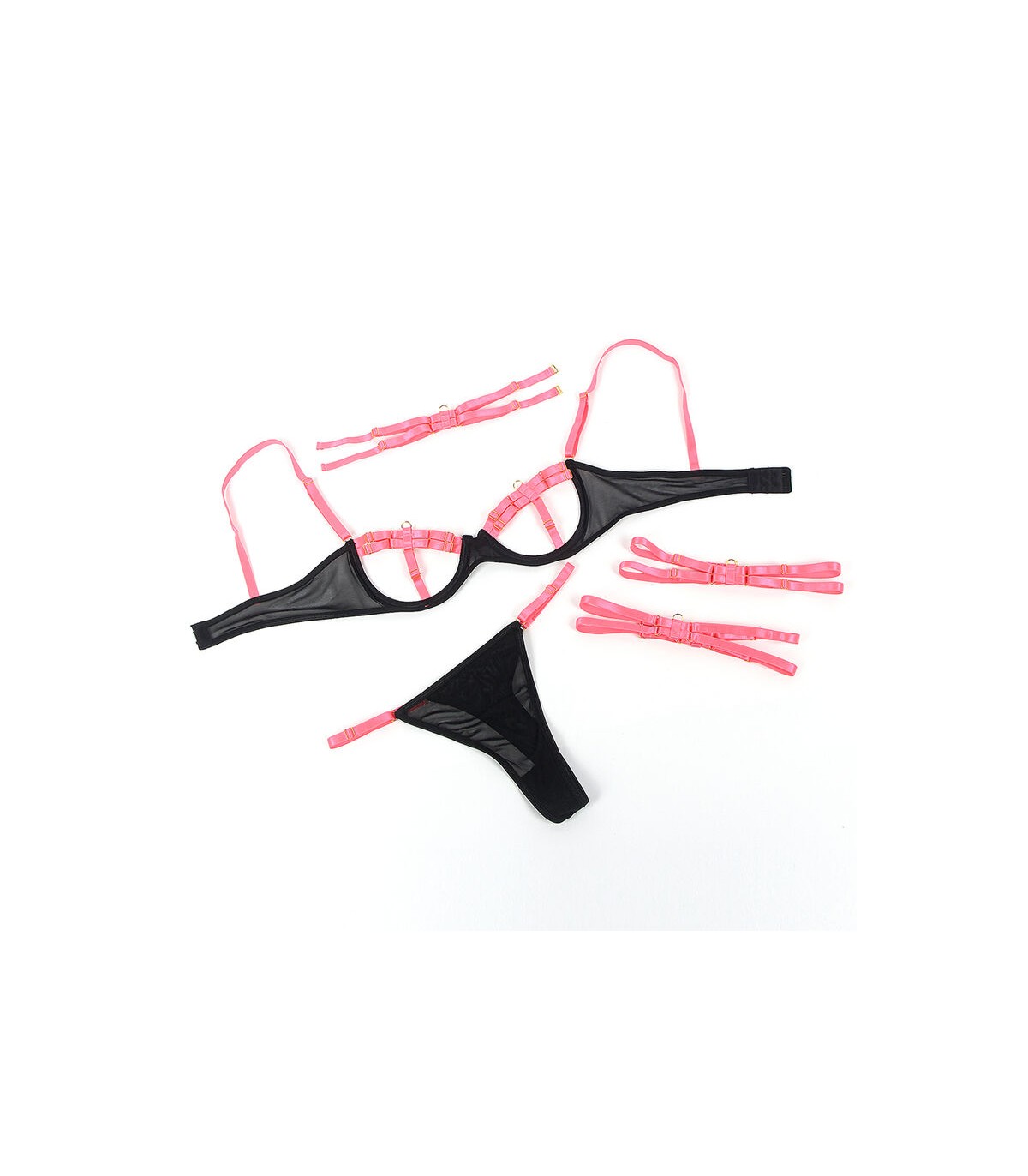 Confeccionado con materiales de alta calidad (95% poliéster y 5% elastano/spandex), este conjunto ofrece una textura suave, gran elasticidad y un ajuste perfecto a las curvas de tu cuerpo. El sujetador presenta un diseño de tiras cruzadas que enmarca y realza el busto, mientras que las transparencias y el contraste de colores en tonos de rosa añaden un aire romántico y sofisticado.