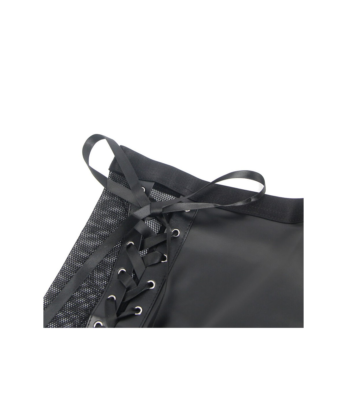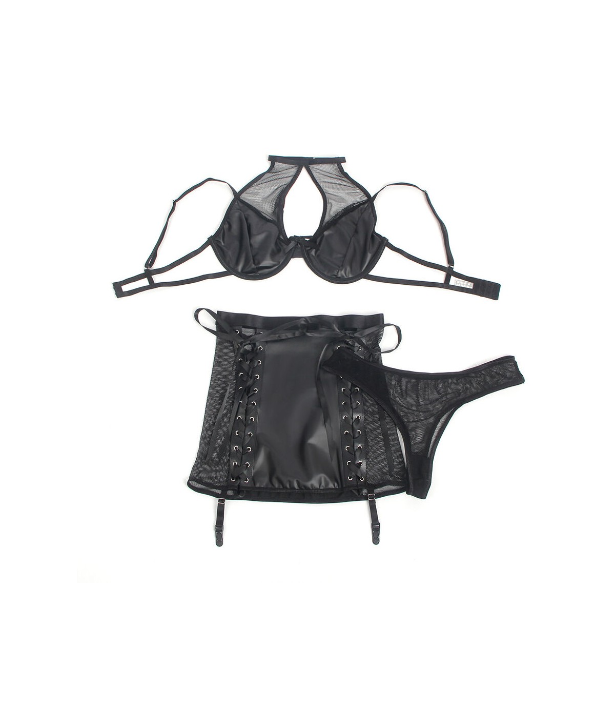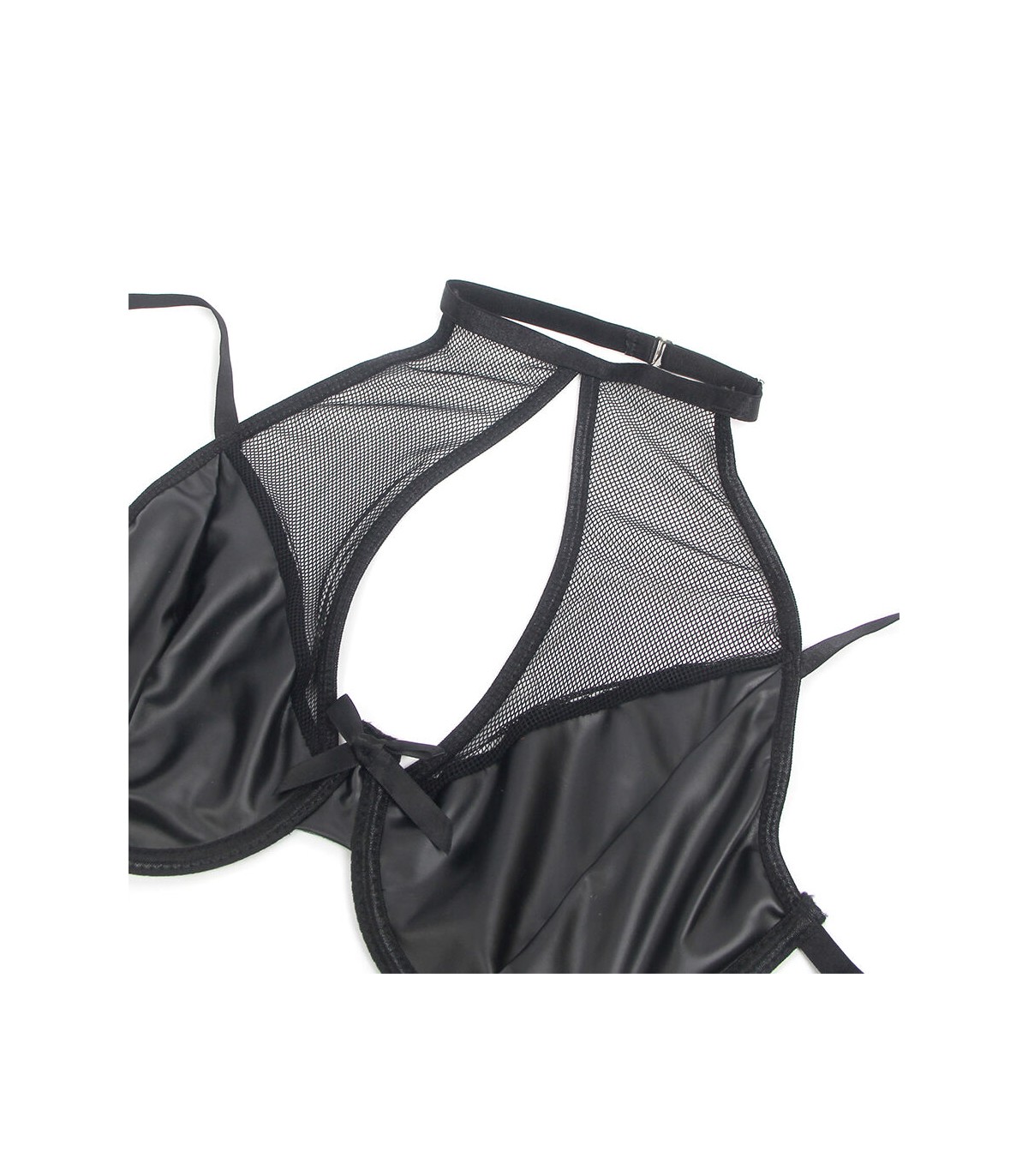 Este set de lencería en efecto cuero (PU leather) y malla translúcida crea un equilibrio perfecto entre provocación y elegancia. El diseño halter resalta los hombros y el escote de manera llamativa, mientras que el material de vinilo le da un toque de rebeldía y poder. Los detalles en malla añaden transparencias estratégicas que insinúan la piel de forma seductora, fusionando lo atrevido con lo sofisticado.