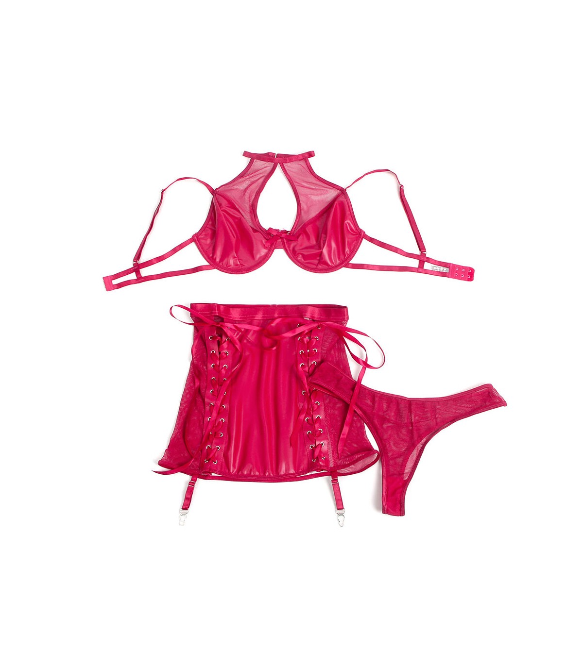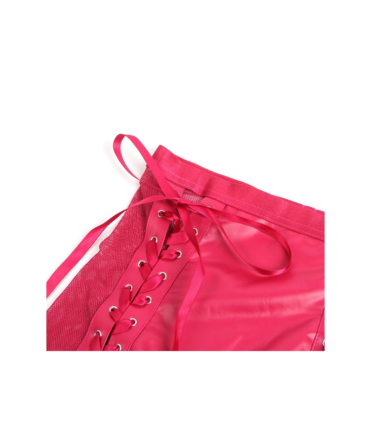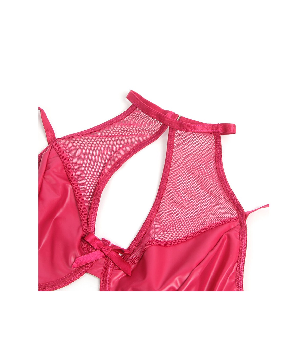 Este set de lencería en efecto cuero (PU leather) rojo y malla translúcida combina lo atrevido con lo elegante. Su diseño halter realza los hombros y el escote de manera llamativa, mientras que el acabado en vinilo rojo intenso agrega un aire de poder y seducción. La malla transparente insinúa la piel en los lugares adecuados, creando un efecto visual cautivador.