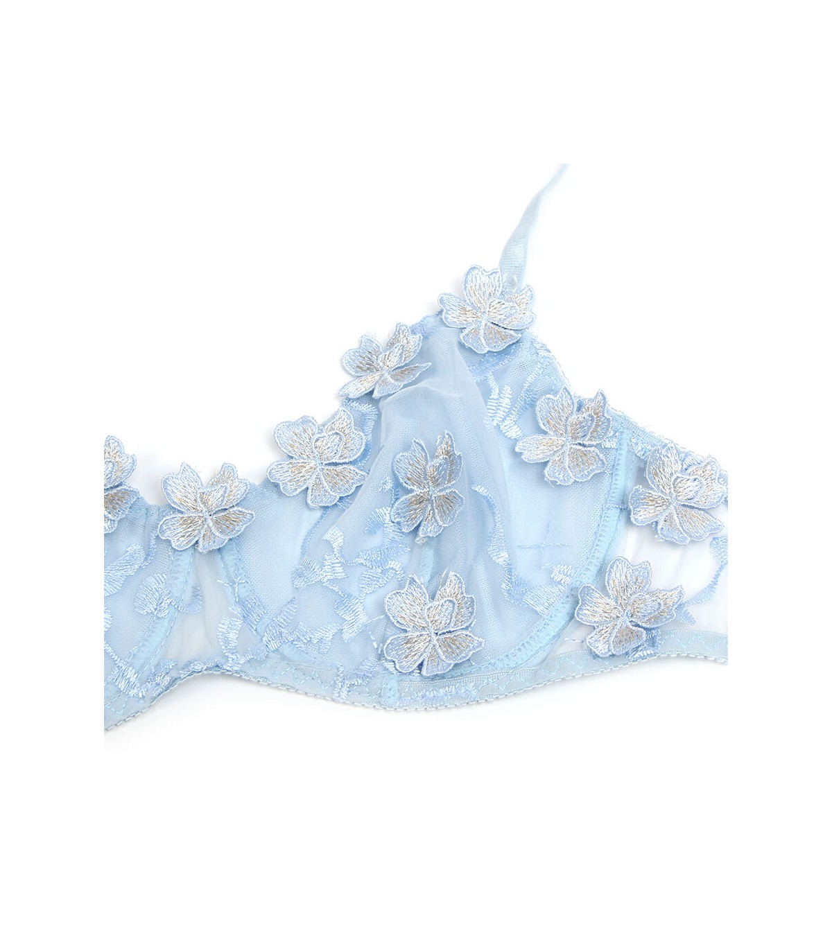 Este exquisito conjunto en tono azul destaca por su malla translúcida con bordados florales, un diseño que combina la delicadeza del encaje con la ligereza de la tela para un acabado etéreo y seductor. El sujetador de encaje, con copas semi-transparentes y detalles bordados, enmarca el busto de manera elegante, brindando una sujeción sutil sin perder la sensualidad. Sus tirantes ajustables y cierre trasero garantizan un ajuste perfecto y cómodo.