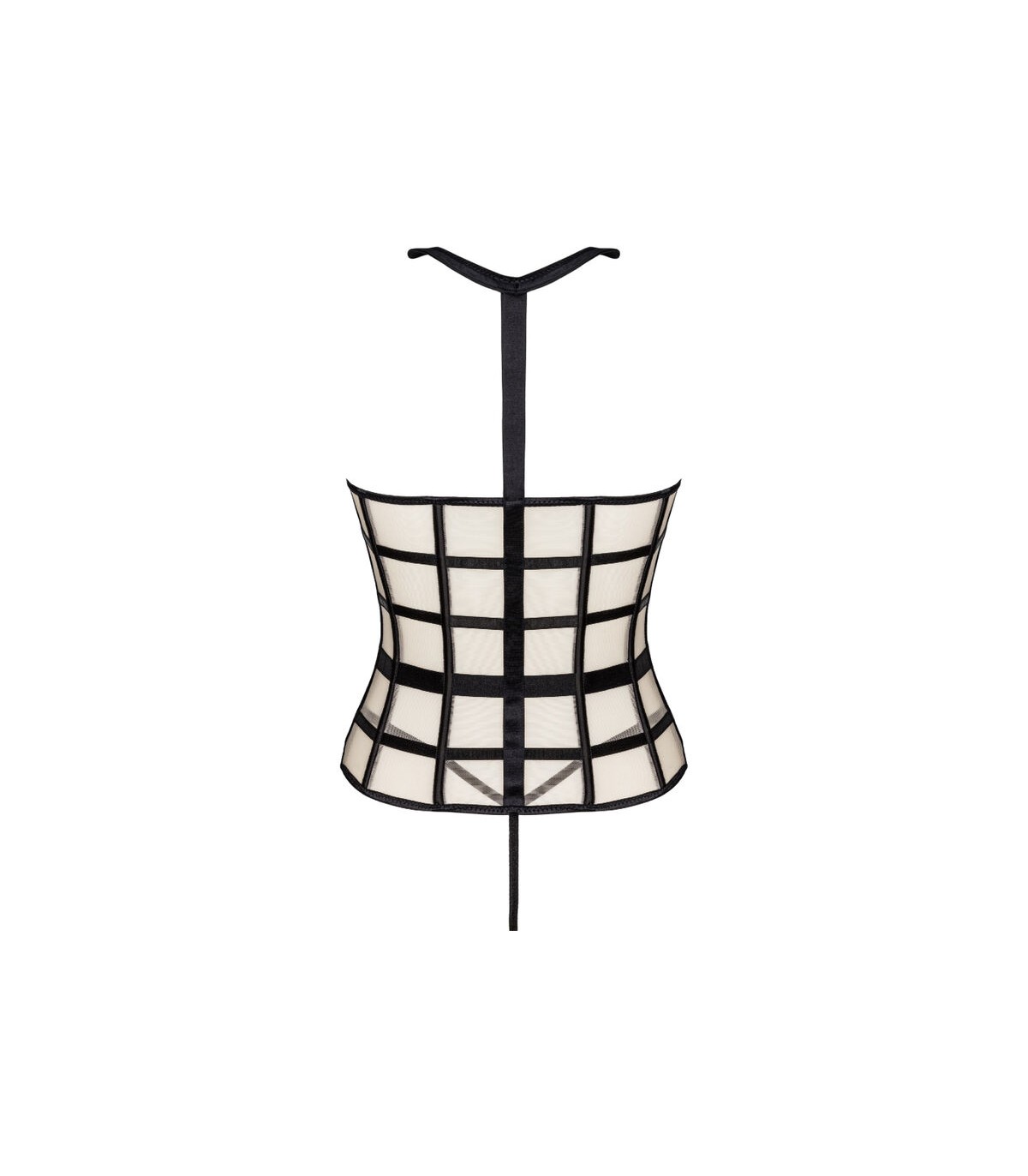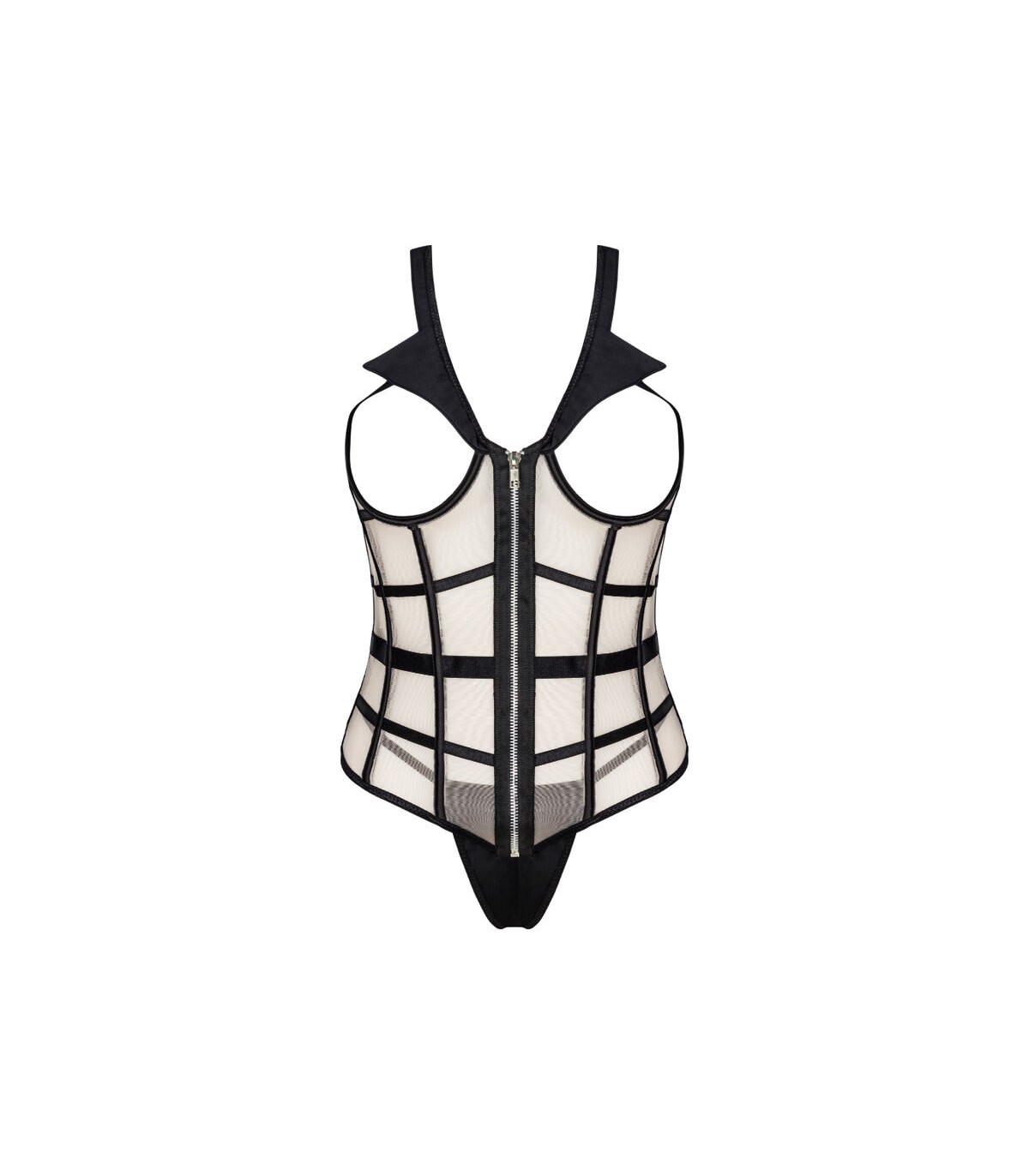 Un conjunto de dos piezas compuesto por un sensual corsé con el pecho al descubierto y un sexy tanga negro. El corsé tiene una cremallera en la parte delantera, lo que facilita su colocación. Los colores del conjunto son el negro y el beige, que juntos crean una atractiva combinación. También vale la pena prestar atención a detalles tentadores como un cuello negro o cinturones negros dispuestos de tal manera que realcen mejor la cintura. Lo que más destaca de este corsé son los recortes que exponen el busto. Esto hace que todo el conjunto sea muy atrevido y provocativo. No queda mucho a la imaginación. Las pegatinas para pezones serán una gran adición al juego y agregarán algo de sabor.