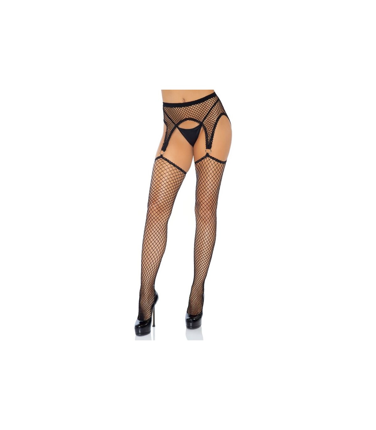 Medias de red con lunares y borde de encaje, tacón cubano y liguero. Con Leg Avenue reforzarás tu feminidad y obtendrás ese toque justo de seducción, sensualidad y elegancia.