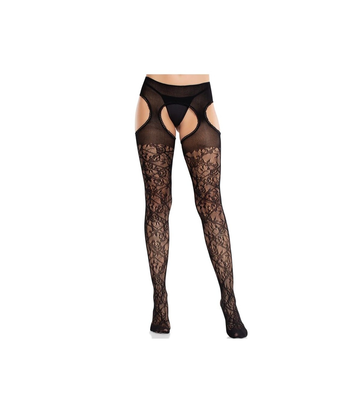 Con un diseño de suspensión integrado, estas medias ofrecen la sofisticación de un liguero sin la incomodidad de las piezas separadas. El panel superior transparente con intrincados detalles de encaje se integra a la perfección con los tirantes del liguero, mientras que la entrepierna abierta y los detalles recortados añaden un toque atrevido a esta prenda ya de por sí seductora.