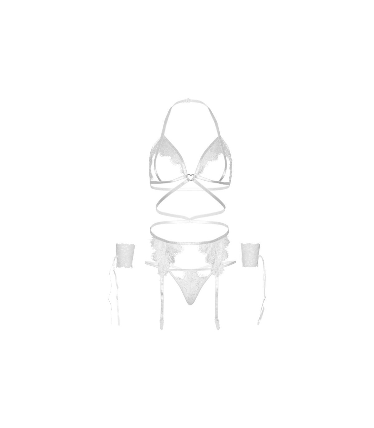 Set 4 piezas. Sujetador con arnés de encaje de copa abierta con aro en forma de corazón, liguero, tanga y puños. Con Leg Avenue reforzarás tu feminidad y obtendrás ese toque justo de seducción, sensualidad y elegancia.