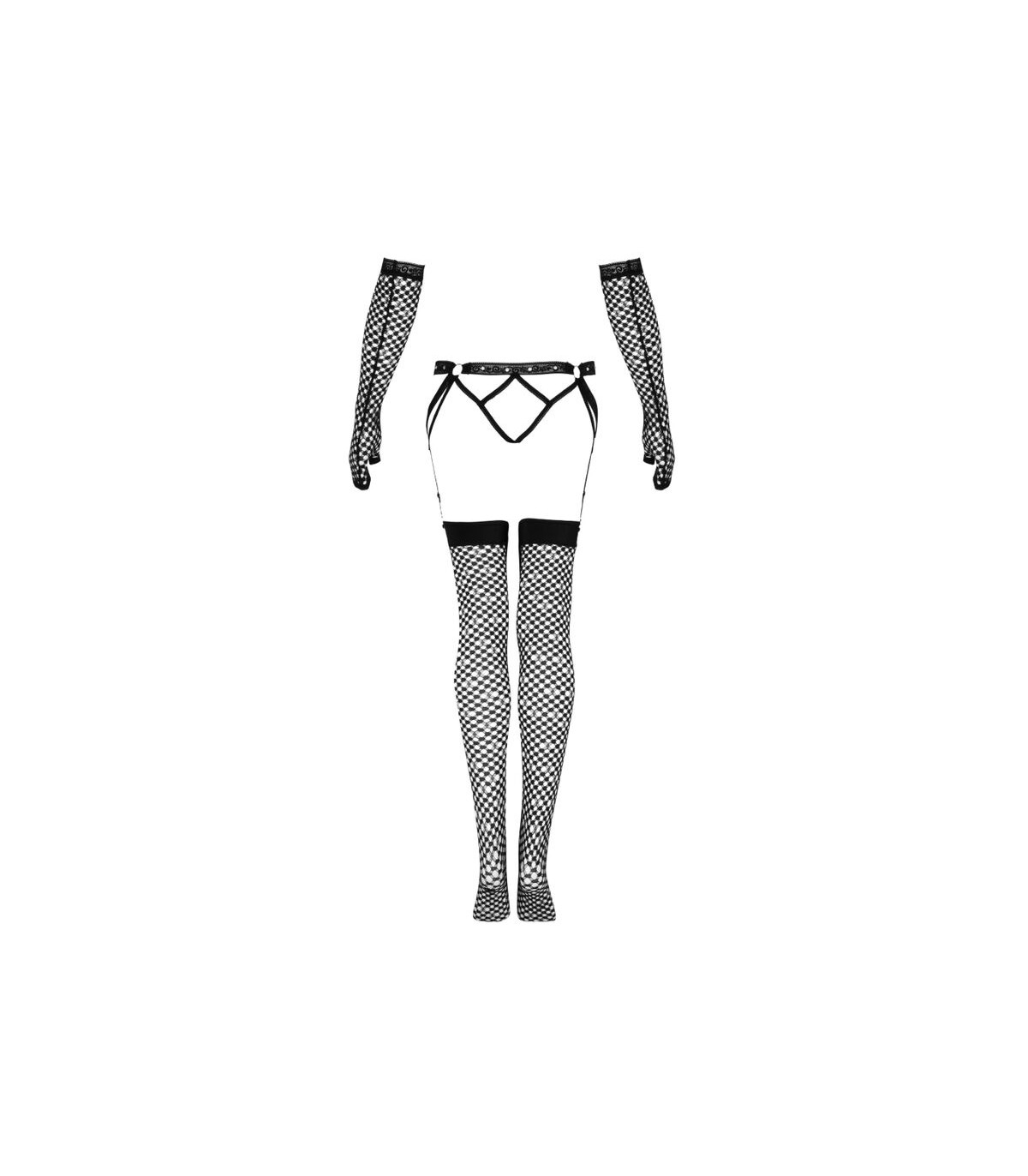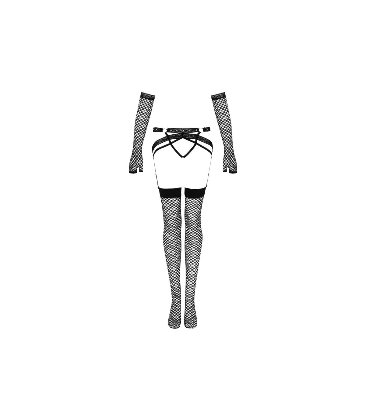 - Guantes: Los guantes de red completan el conjunto, añadiendo un toque final de sofisticación y misterio. Su diseño elegante y provocativo hace que sean el complemento perfecto para este set.