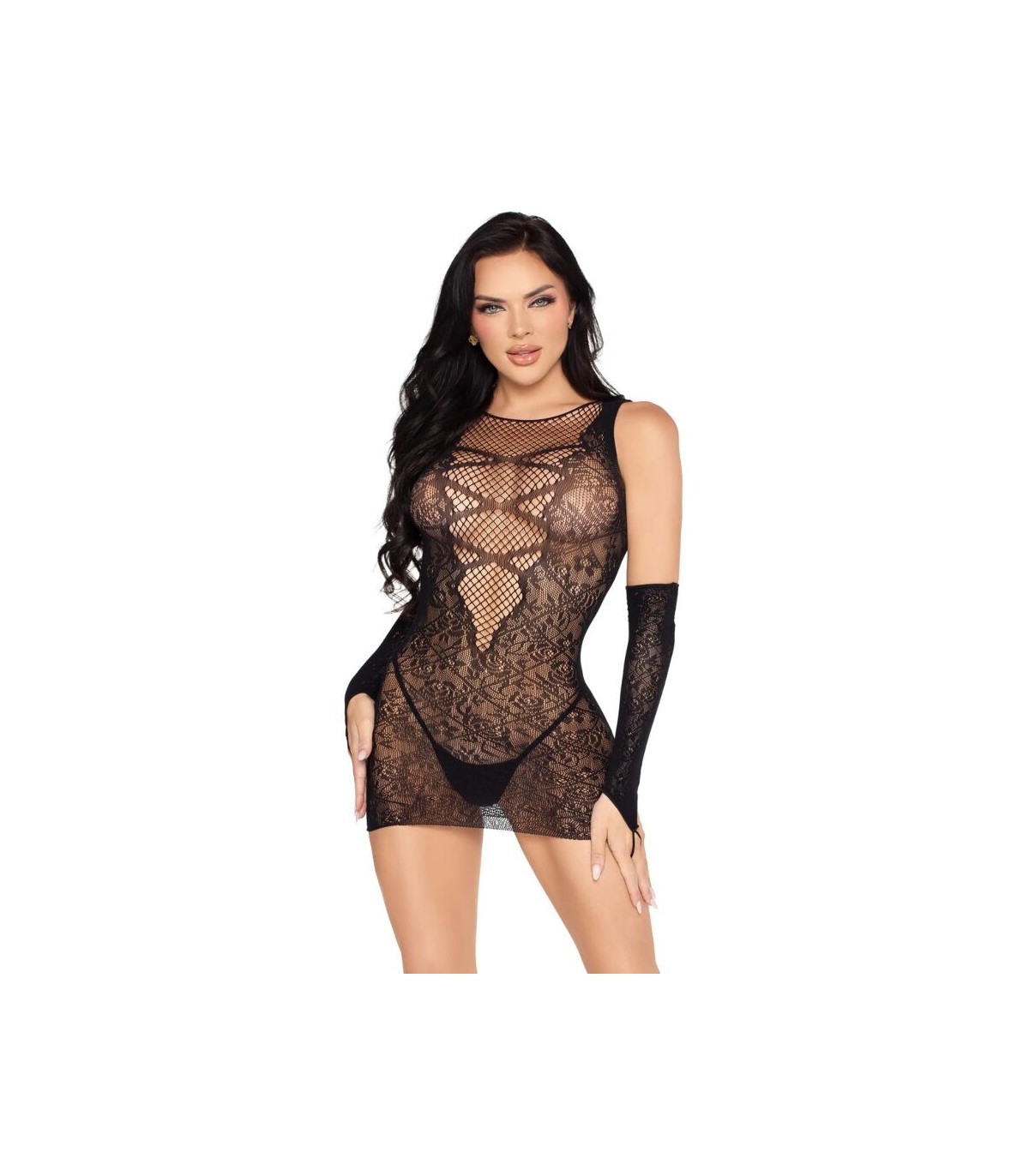 Libera tu lado más atrevido con este mini vestido de encaje y malla. Este modelo sin mangas tiene un cuello redondo, un efecto de cordones en malla al frente y encaje floral. La espalda combina malla y encaje creando una ilusión de escote que acentúa la cintura y los glúteos. El vestido incluye guantes de encaje a juego.