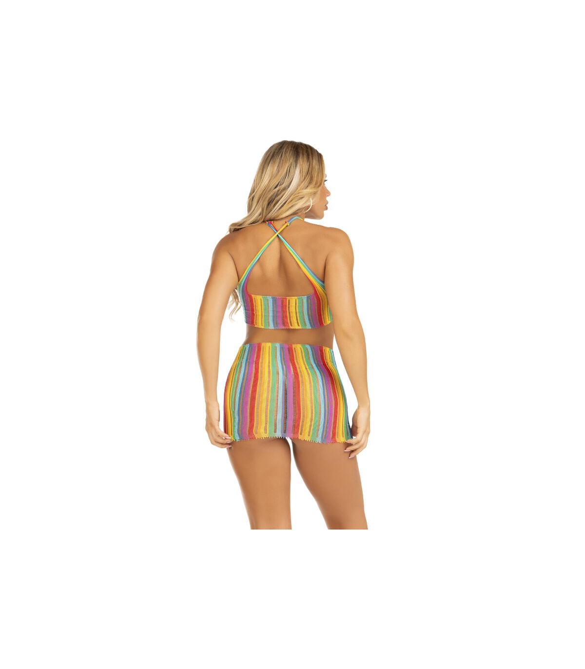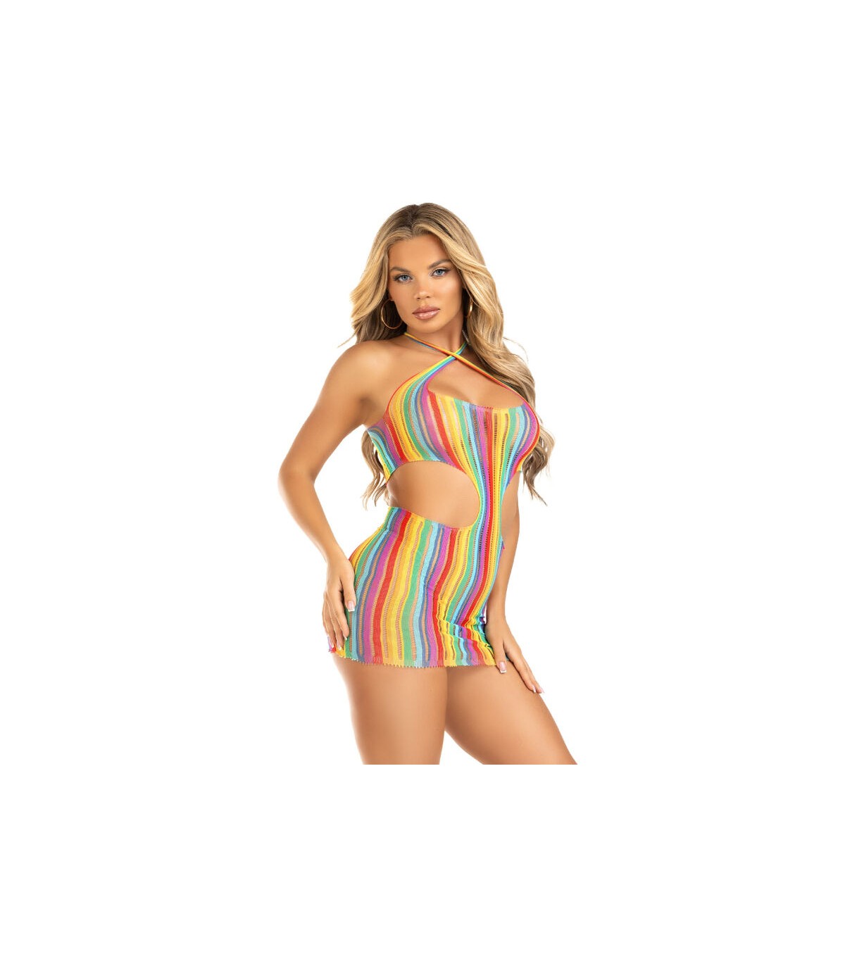 Ya sea para una salida informal con amigos, una fiesta en la playa o cualquier otra ocasión que requiera un toque de color y estilo, el minivestido halter cruzado con rayas arcoíris es una opción versátil y emocionante que te hará destacar con confianza y personalidad.