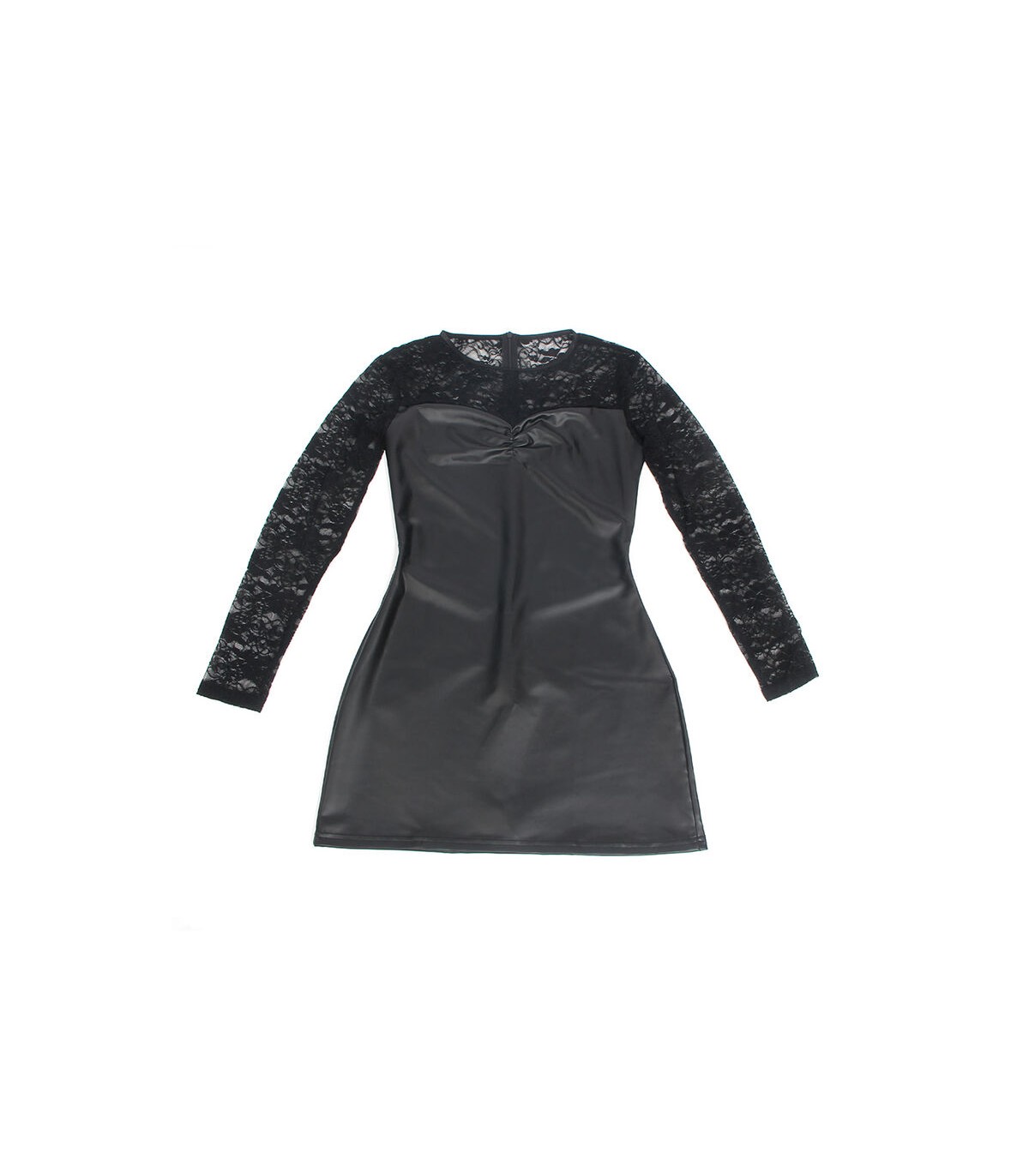 Confeccionado con una mezcla premium de 95% poliéster y 5% elastano/spandex, este camisón ofrece una textura suave, elástica y cómoda que se ajusta perfectamente al cuerpo. Las mangas largas aportan un toque de sofisticación, mientras que los detalles de encaje delicado en el busto y a lo largo del borde inferior le otorgan un aire romántico y seductor. El acabado en cuero PU le da un brillo elegante y audaz, mientras que su ajuste elástico y favorecedor resalta cada curva de manera natural.