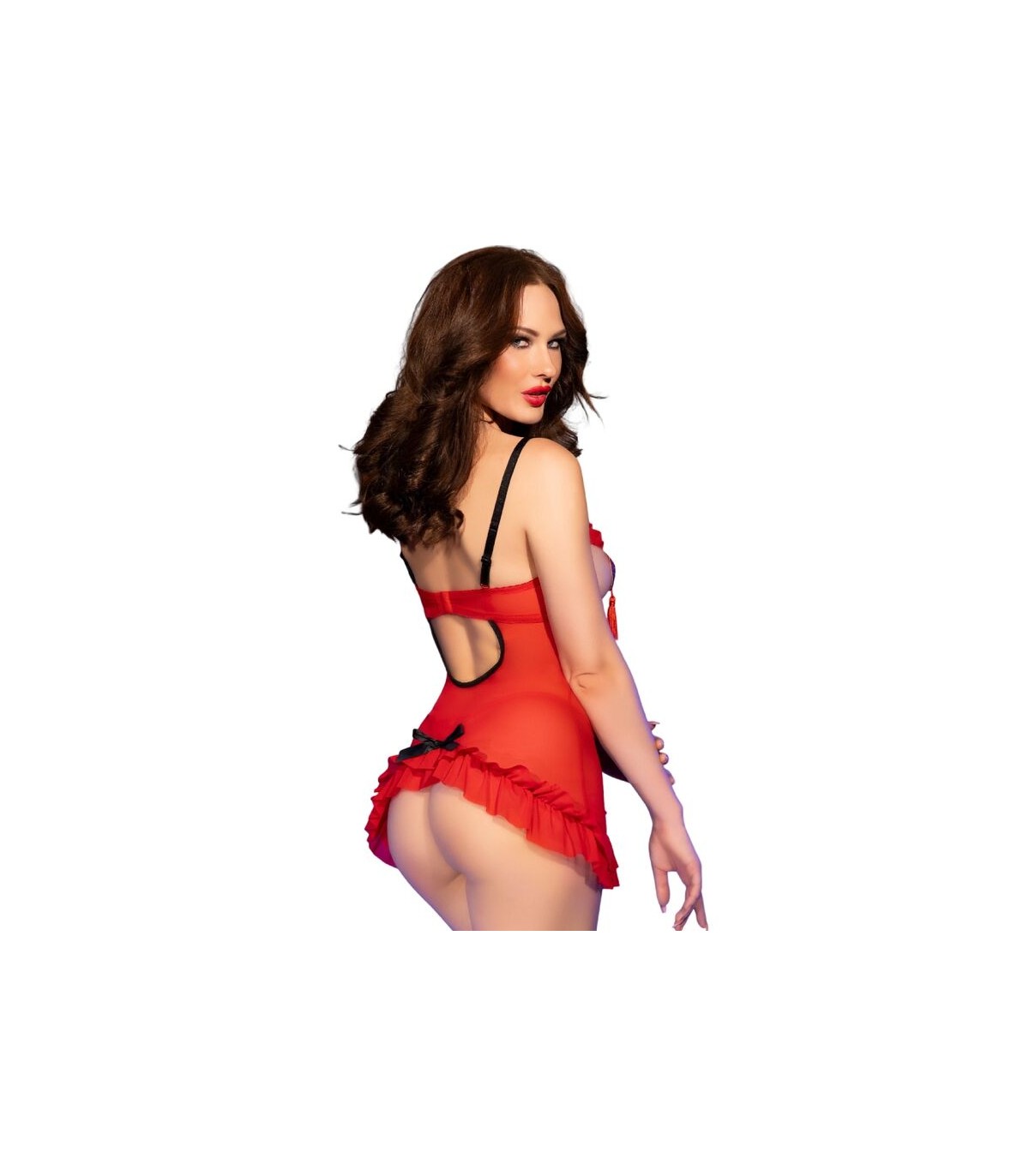 Confeccionada en delicado tul transparente, revela sensualmente el busto, adornado con dulces volantes y un encantador lazo negro.