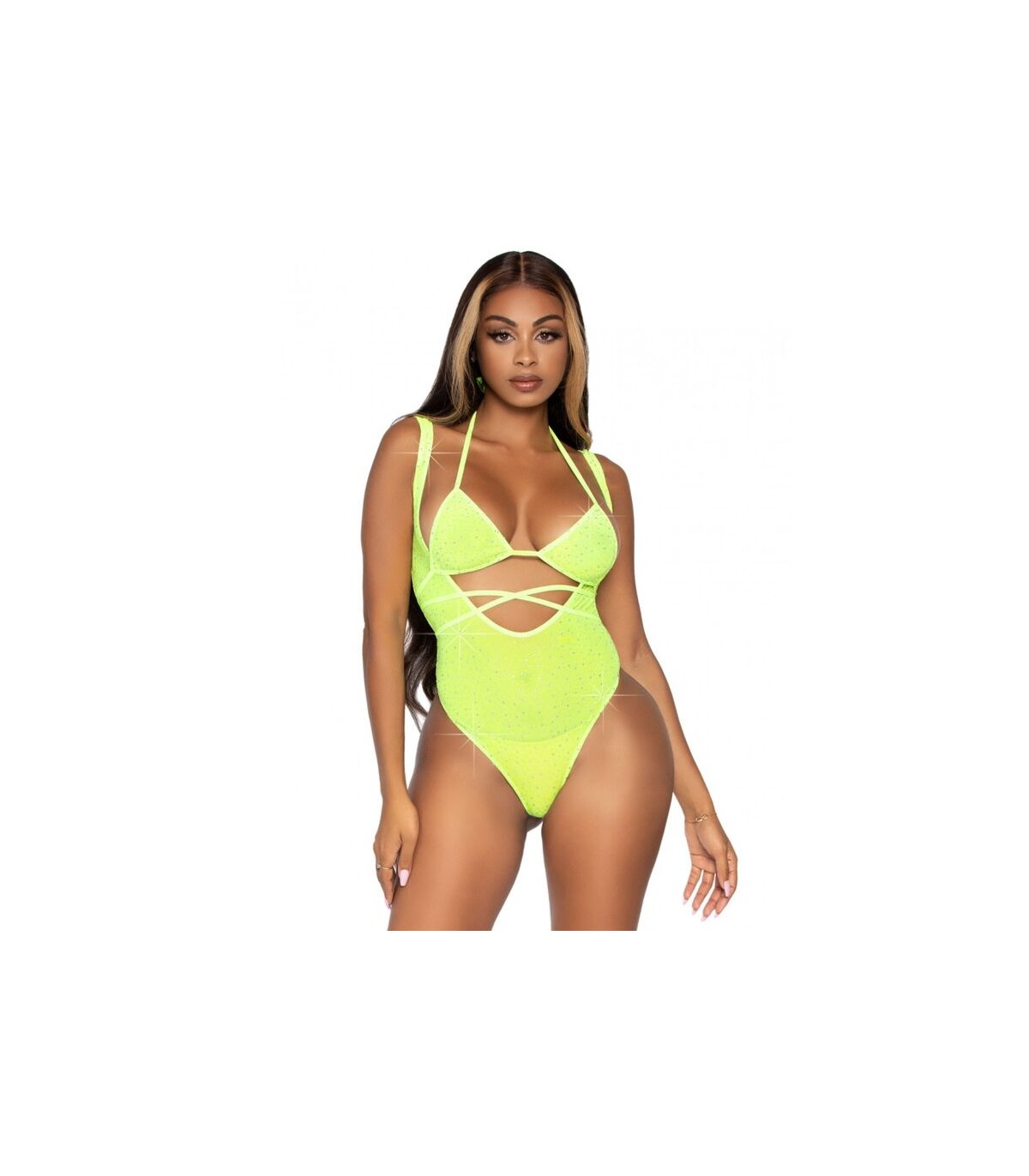 Conjunto de red y strass que incluye un top de bikini con tirantes envolventes y un body de tirantes. Con Leg Avenue reforzarás tu feminidad y obtendrás ese toque justo de seducción, sensualidad y elegancia.